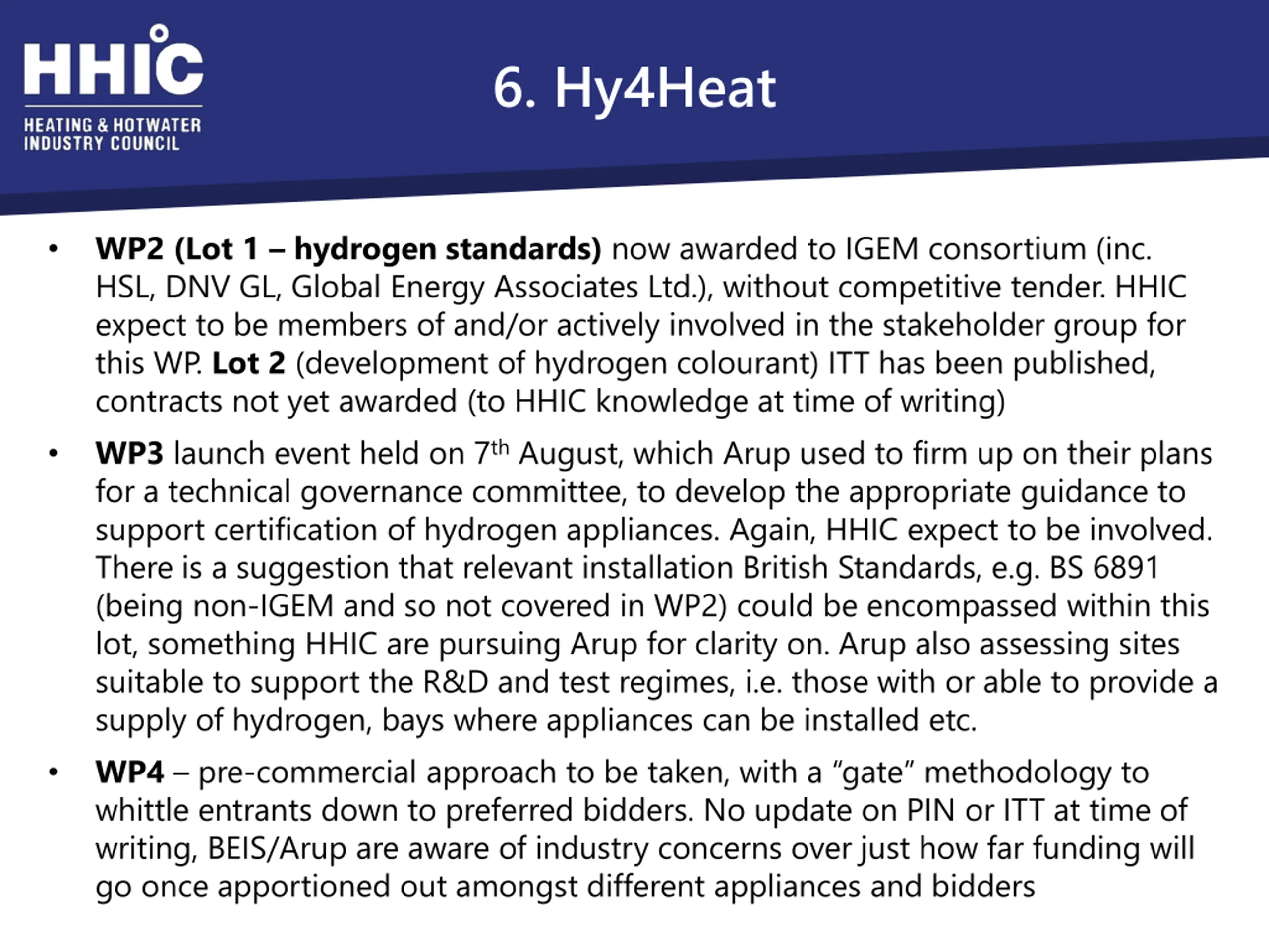 6. Hy4Heat WP2 (Lot 1 hydrogen standards) now awarded to IGEM consortium (inc. HSL, DNV GL, Global Energy Associates Ltd.), without competitive tender. HHIC expect to be members of and/or actively involved in the stakeholder group for this WP. Lot 2 (development of hydrogen colourant) ITT has been published, contracts not yet awarded (to HHIC knowledge at time of writing) WP3 launch event held on 7th August, which Arup used to firm up on their plans for a technical governance committee, to develop the appropriate guidance to support certification of hydrogen appliances. Again, HHIC expect to be involved. There is a suggestion that relevant installation British Standards, e.g. BS 6891 (being non-IGEM and so not covered in WP2) could be encompassed within this lot, something HHIC are pursuing Arup for clarity on. Arup also assessing sites suitable to support the R&D and test regimes, i.e. those with or able to provide a supply of hydrogen, bays where appliances can be installed etc. WP4 pre-commercial approach to be taken, with a gate methodology to whittle entrants down to preferred bidders. No update on PIN or ITT at time of writing, BEIS/Arup are aware of industry concerns over just how far funding will go once apportioned out amongst different appliances and bidders