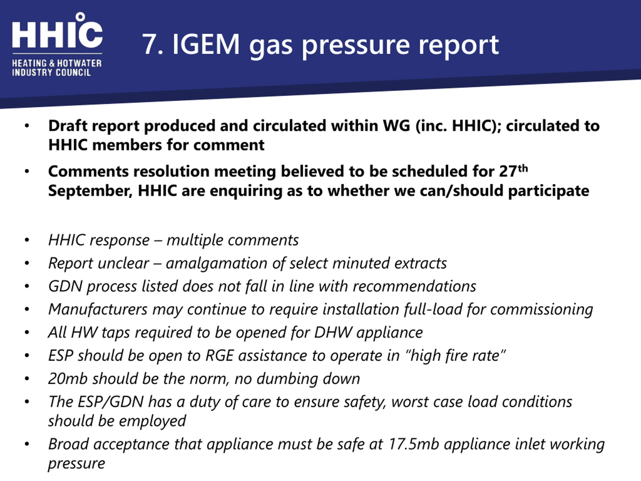 7. IGEM gas pressure report Draft report produced and circulated within WG (inc. HHIC); circulated to HHIC members for comment Comments resolution meeting believed to be scheduled for 27th September, HHIC are enquiring as to whether we can/should participate HHIC response multiple comments Report unclear amalgamation of select minuted extracts GDN process listed does not fall in line with recommendations Manufacturers may continue to require installation full-load for commissioning All HW taps required to be opened for DHW appliance ESP should be open to RGE assistance to operate in high fire rate 20mb should be the norm, no dumbing down The ESP/GDN has a duty of care to ensure safety, worst case load conditions should be employed Broad acceptance that appliance must be safe at 17.5mb appliance inlet working pressure
