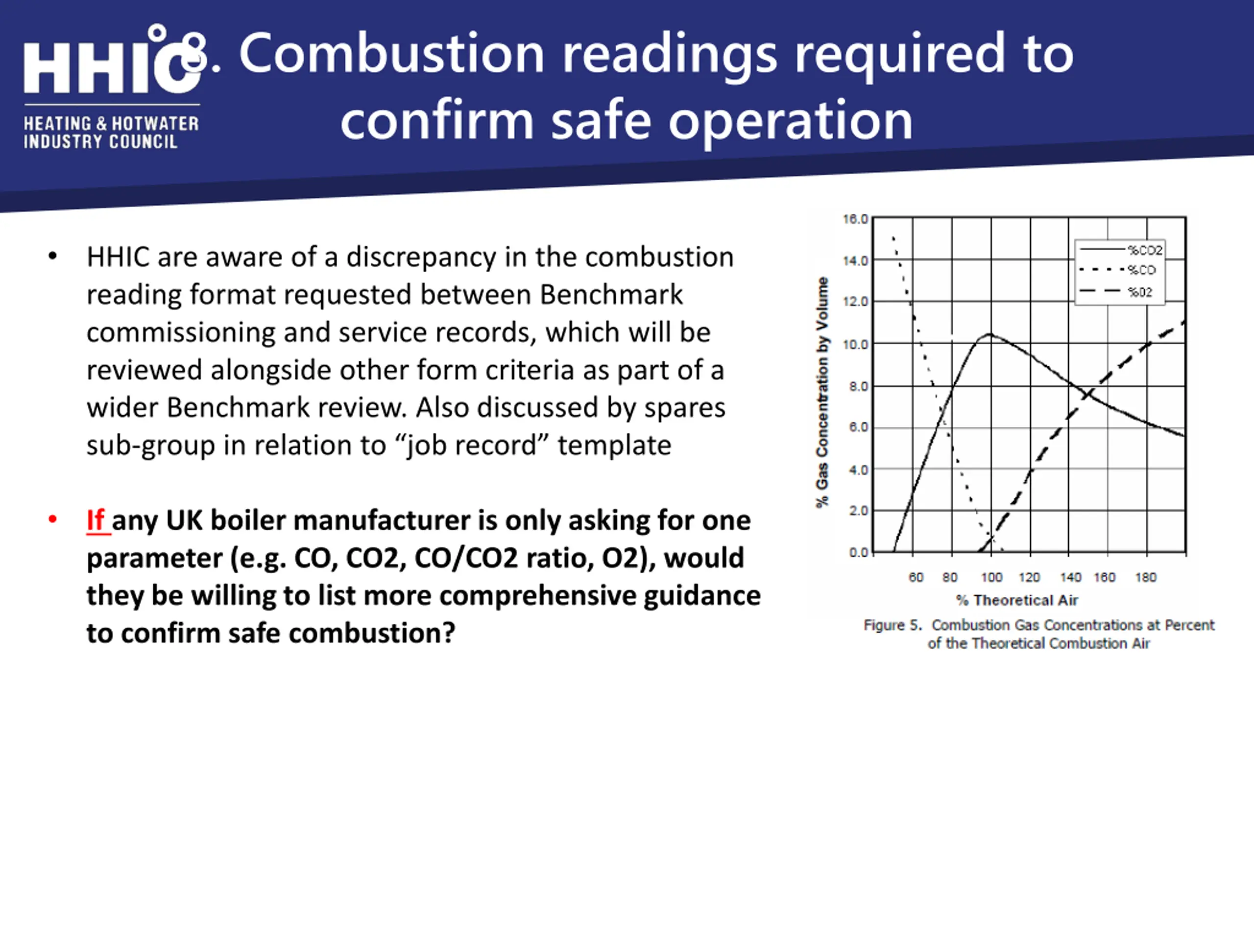 8. Combustion readings required to confirm safe operation HHIC are aware of a discrepancy in the combustion reading format requested between Benchmark commissioning and service records, which will be reviewed alongside other form criteria as part of a wider Benchmark review. Also discussed by spares sub-group in relation to job record template If any UK boiler manufacturer is only asking for one parameter (e.g. CO, CO2, CO/CO2 ratio, O2), would they be willing to list more comprehensive guidance to confirm safe combustion?