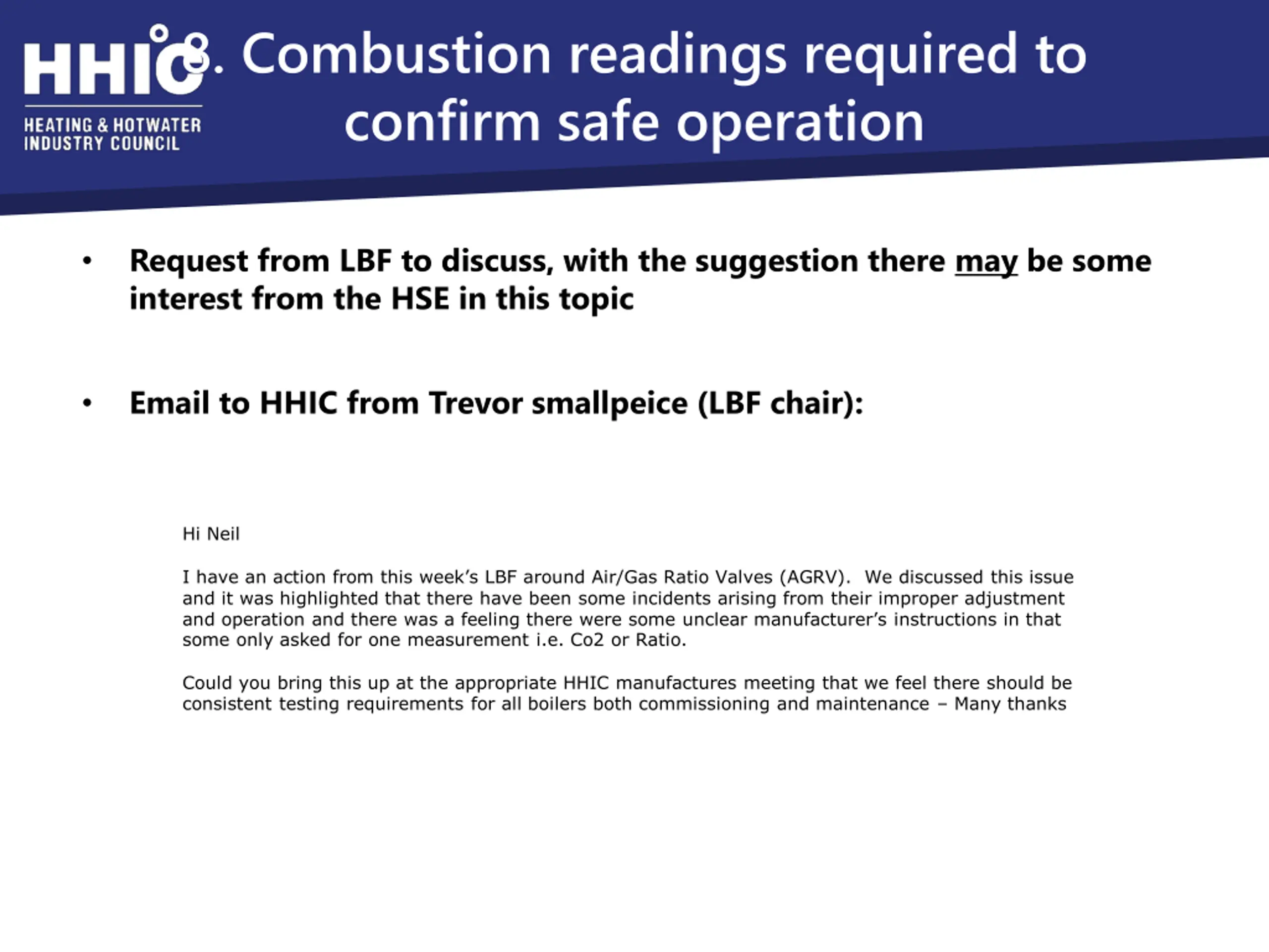 8. Combustion readings required to confirm safe operation Request from LBF to discuss, with the suggestion there may be some interest from the HSE in this topic Email to HHIC from Trevor smallpeice (LBF chair): Hi Neil I have an action from this week s LBF around Air/Gas Ratio Valves (AGRV). We discussed this issue and it was highlighted that there have been some incidents arising from their improper adjustment and operation and there was a feeling there were some unclear manufacturer s instructions in that some only asked for one measurement i.e. Co2 or Ratio. Could you bring this up at the appropriate HHIC manufactures meeting that we feel there should be consistent testing requirements for all boilers both commissioning and maintenance Many thanks