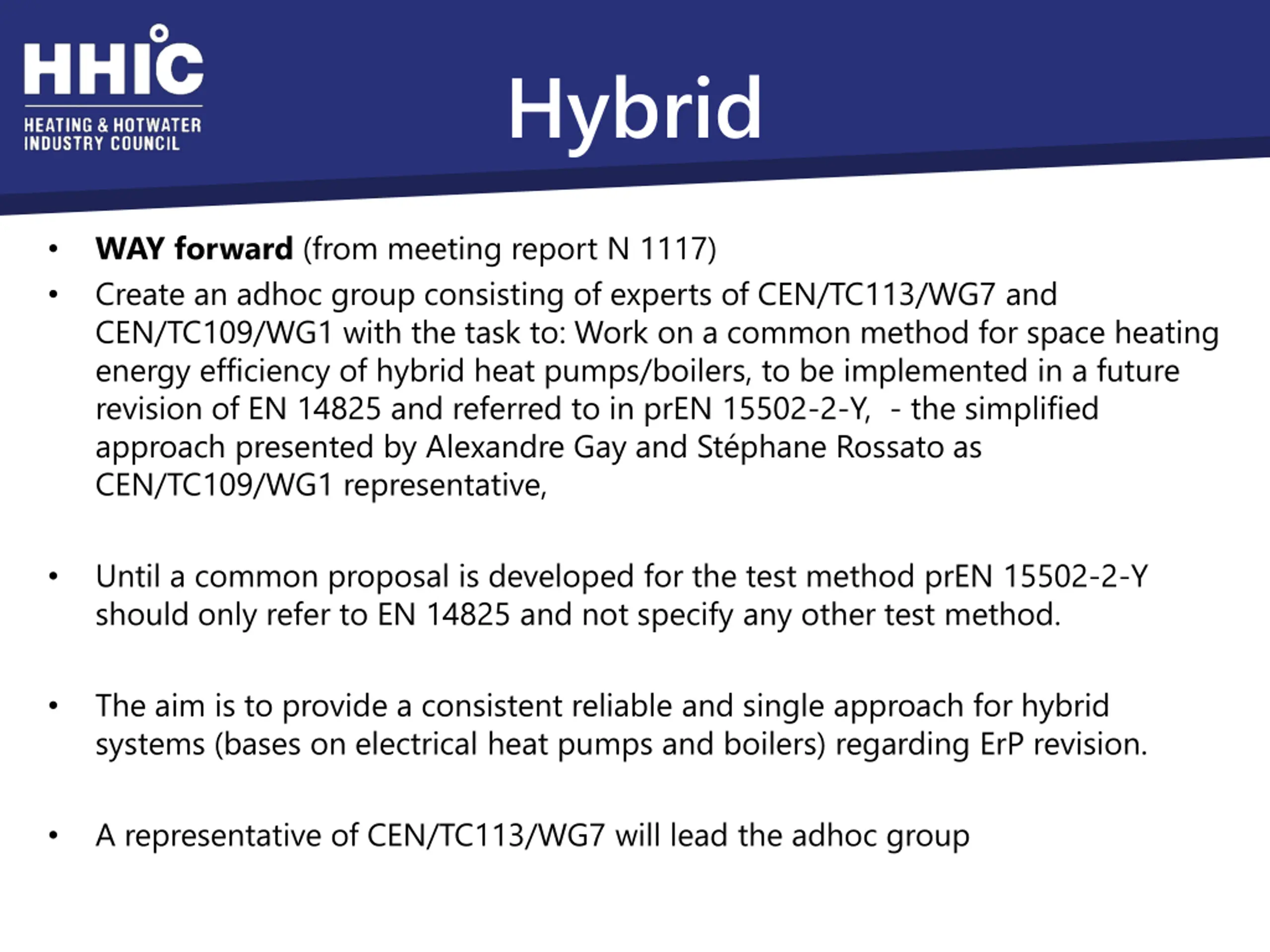 Hybrid WAY forward (from meeting report N 1117) Create an adhoc group consisting of experts of CEN/TC113/WG7 and CEN/TC109/WG1 with the task to: Work on a common method for space heating energy efficiency of hybrid heat pumps/boilers, to be implemented in a future revision of EN 14825 and referred to in prEN 15502-2-Y, - the simplified approach presented by Alexandre Gay and St phane Rossato as CEN/TC109/WG1 representative, Until a common proposal is developed for the test method prEN 15502-2-Y should only refer to EN 14825 and not specify any other test method. The aim is to provide a consistent reliable and single approach for hybrid systems (bases on electrical heat pumps and boilers) regarding ErP revision. A representative of CEN/TC113/WG7 will lead the adhoc group