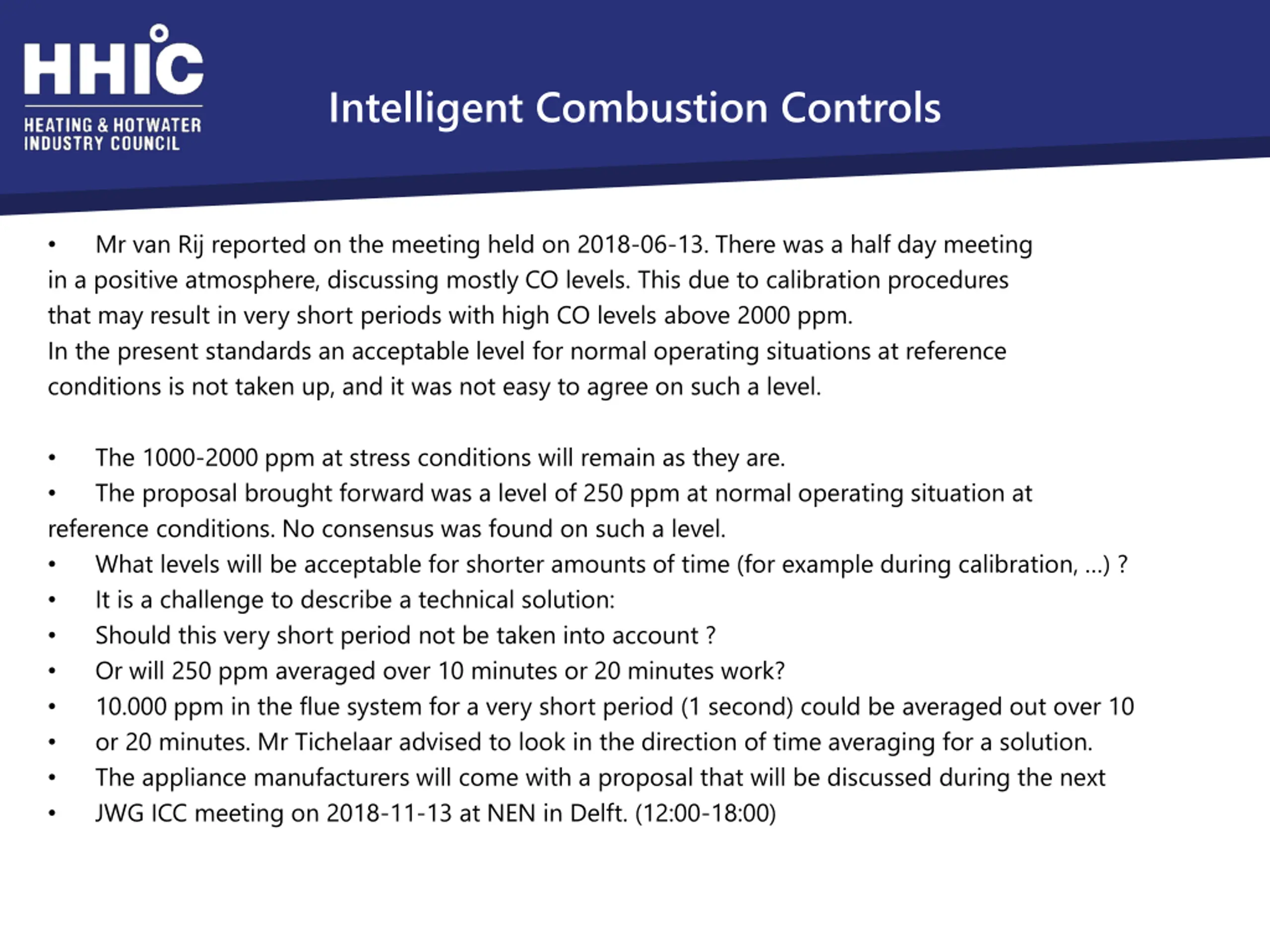 Intelligent Combustion Controls Mr van Rij reported on the meeting held on 2018-06-13. There was a half day meeting in a positive atmosphere, discussing mostly CO levels. This due to calibration procedures that may result in very short periods with high CO levels above 2000 ppm. In the present standards an acceptable level for normal operating situations at reference conditions is not taken up, and it was not easy to agree on such a level. The 1000-2000 ppm at stress conditions will remain as they are. The proposal brought forward was a level of 250 ppm at normal operating situation at reference conditions. No consensus was found on such a level. What levels will be acceptable for shorter amounts of time (for example during calibration, ) ? It is a challenge to describe a technical solution: Should this very short period not be taken into account ? Or will 250 ppm averaged over 10 minutes or 20 minutes work? 10.000 ppm in the flue system for a very short period (1 second) could be averaged out over 10 or 20 minutes. Mr Tichelaar advised to look in the direction of time averaging for a solution. The appliance manufacturers will come with a proposal that will be discussed during the next JWG ICC meeting on 2018-11-13 at NEN in Delft. (12:00-18:00)