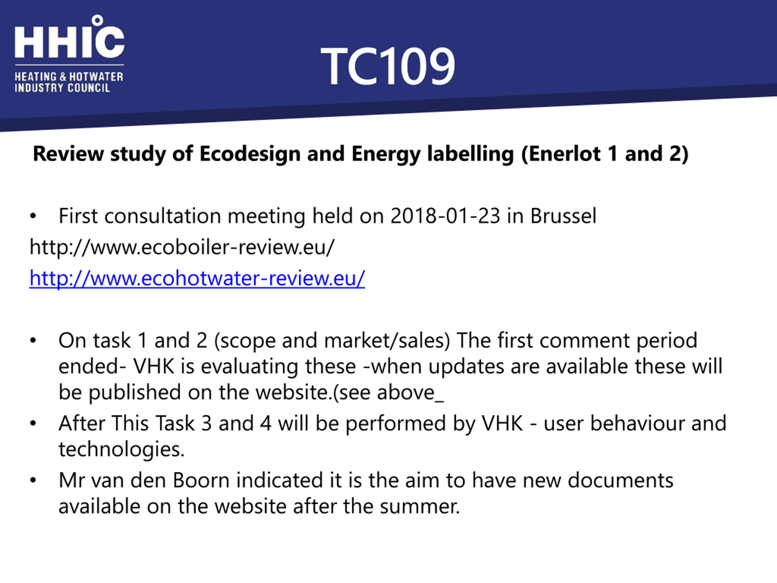 TC109 Review study of Ecodesign and Energy labelling (Enerlot 1 and 2) First consultation meeting held on 2018-01-23 in Brussel http://www.ecoboiler-review.eu/ http://www.ecohotwater-review.eu/ On task 1 and 2 (scope and market/sales) The first comment period ended- VHK is evaluating these -when updates are available these will be published on the website.(see above_ After This Task 3 and 4 will be performed by VHK - user behaviour and technologies. Mr van den Boorn indicated it is the aim to have new documents available on the website after the summer.