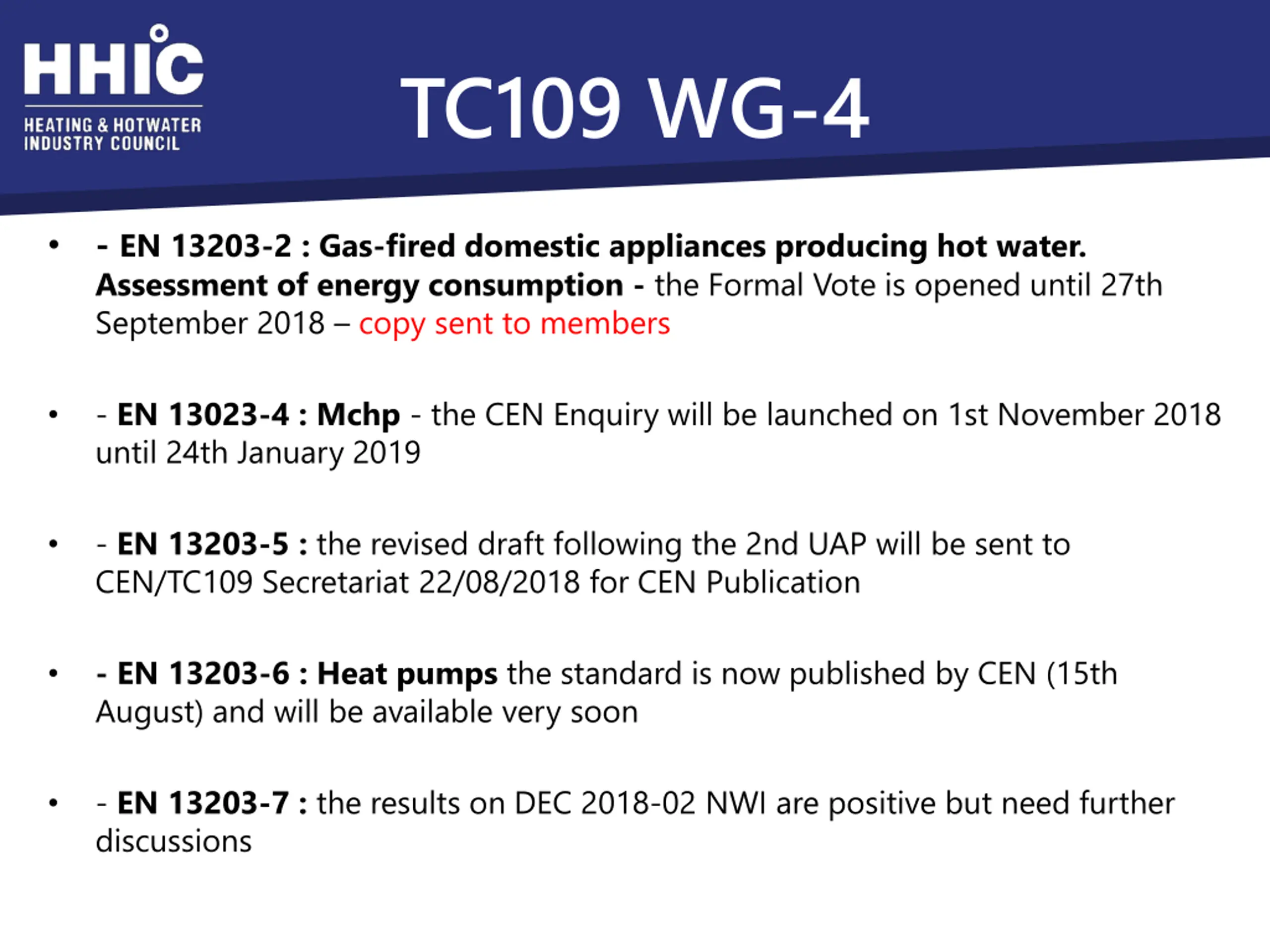 TC109 WG-4 - EN 13203-2 : Gas-fired domestic appliances producing hot water. Assessment of energy consumption - the Formal Vote is opened until 27th September 2018 copy sent to members - EN 13023-4 : Mchp - the CEN Enquiry will be launched on 1st November 2018 until 24th January 2019 - EN 13203-5 : the revised draft following the 2nd UAP will be sent to CEN/TC109 Secretariat 22/08/2018 for CEN Publication - EN 13203-6 : Heat pumps the standard is now published by CEN (15th August) and will be available very soon - EN 13203-7 : the results on DEC 2018-02 NWI are positive but need further discussions