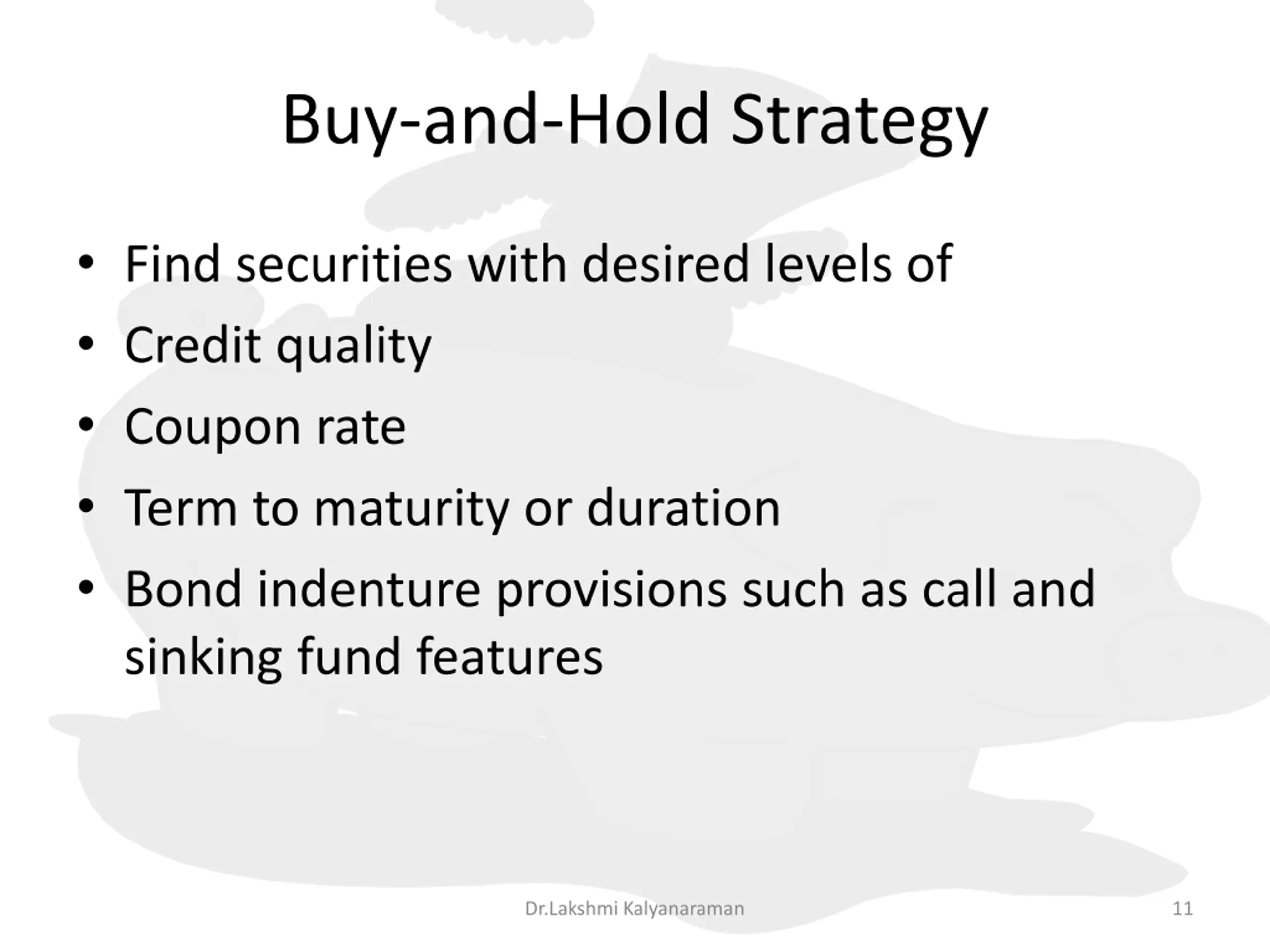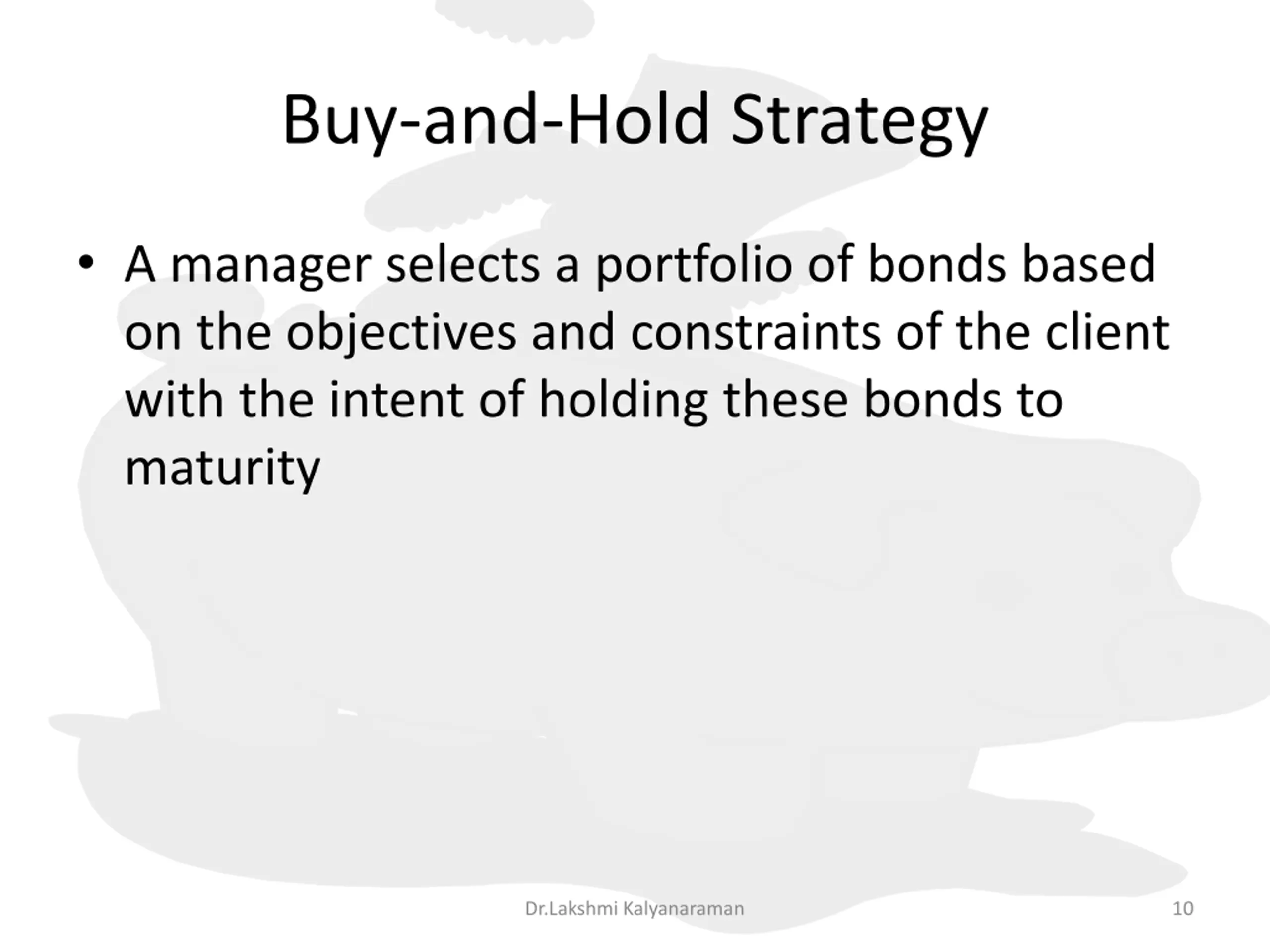 Buy-and-Hold Strategy A manager selects a portfolio of bonds based on the objectives and constraints of the client with the intent of holding these bonds to maturity Dr.Lakshmi Kalyanaraman 10
