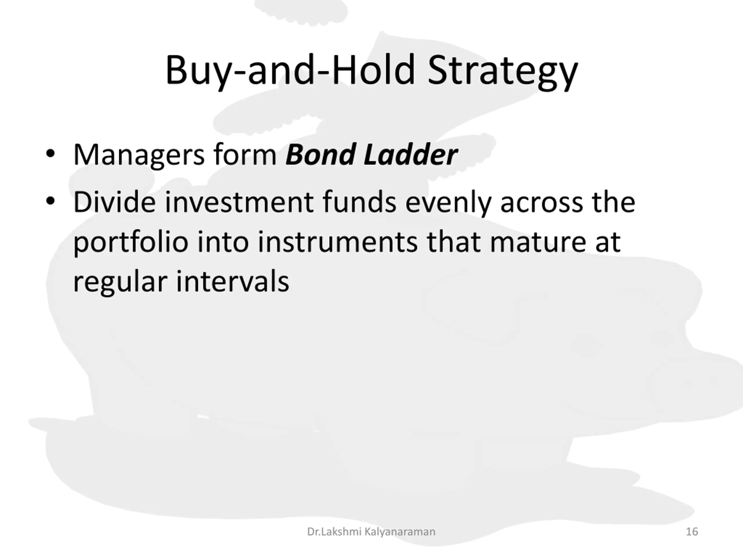 Buy-and-Hold Strategy For example, a manager with an intermediate term investment focus, instead of investing all of her funds in a five-year zero coupon security Which will become a four-year security after one year Could follow a laddered approach Dr.Lakshmi Kalyanaraman 17