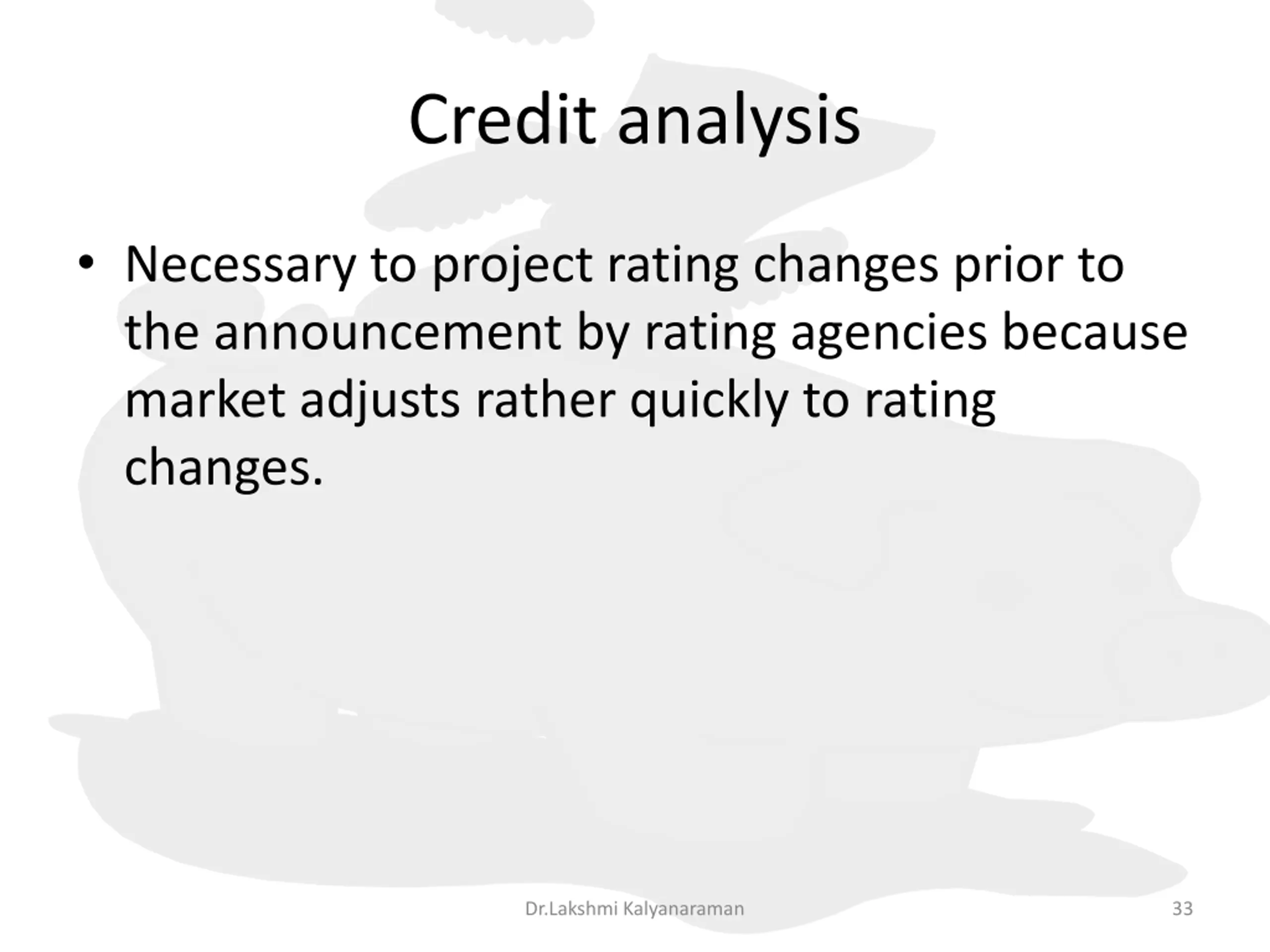 Credit analysis Necessary to project rating changes prior to the announcement by rating agencies because market adjusts rather quickly to rating changes. Dr.Lakshmi Kalyanaraman 33