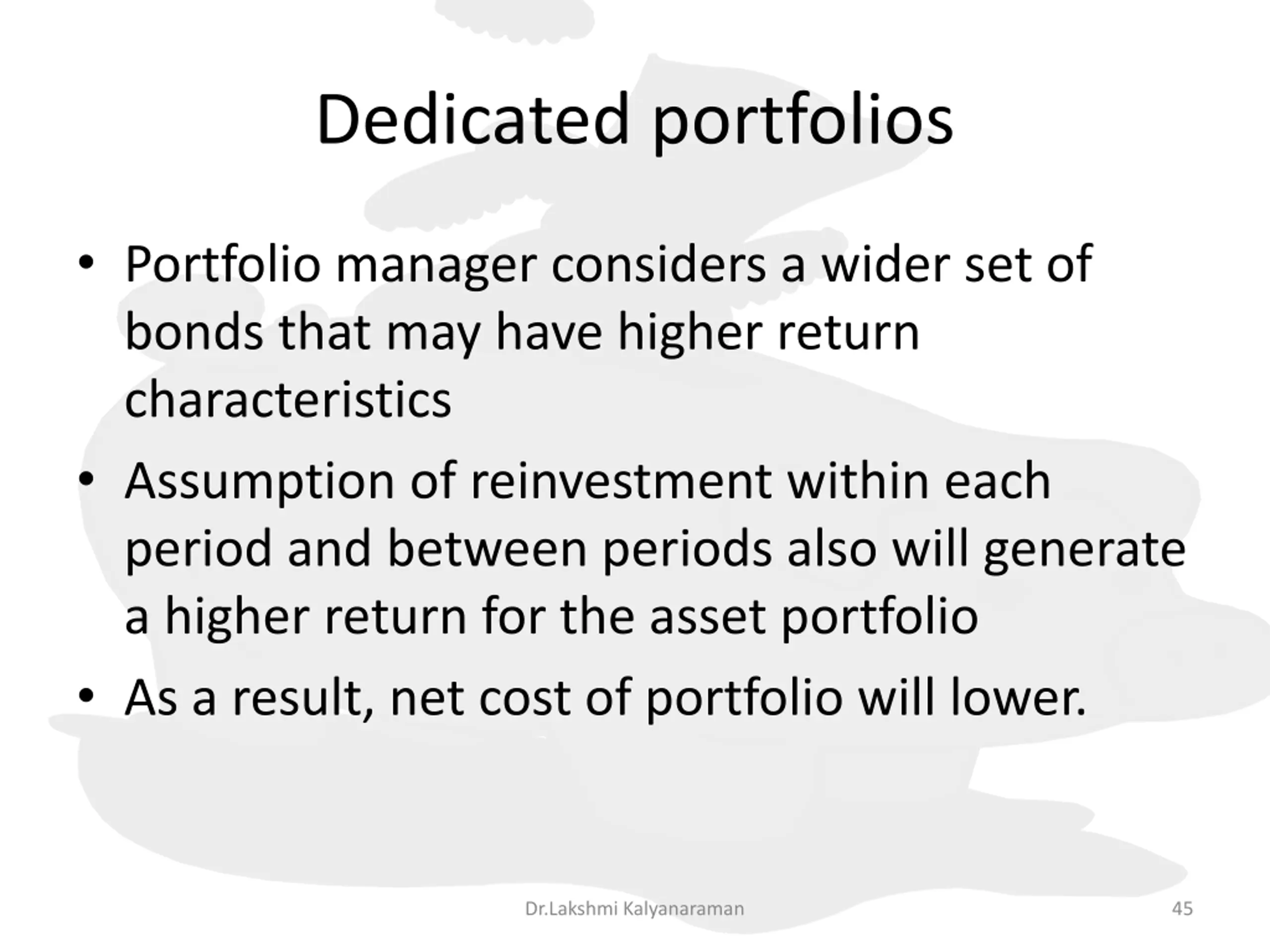 Dedicated portfolios Portfolio manager considers a wider set of bonds that may have higher return characteristics Assumption of reinvestment within each period and between periods also will generate a higher return for the asset portfolio As a result, net cost of portfolio will lower. Dr.Lakshmi Kalyanaraman 45
