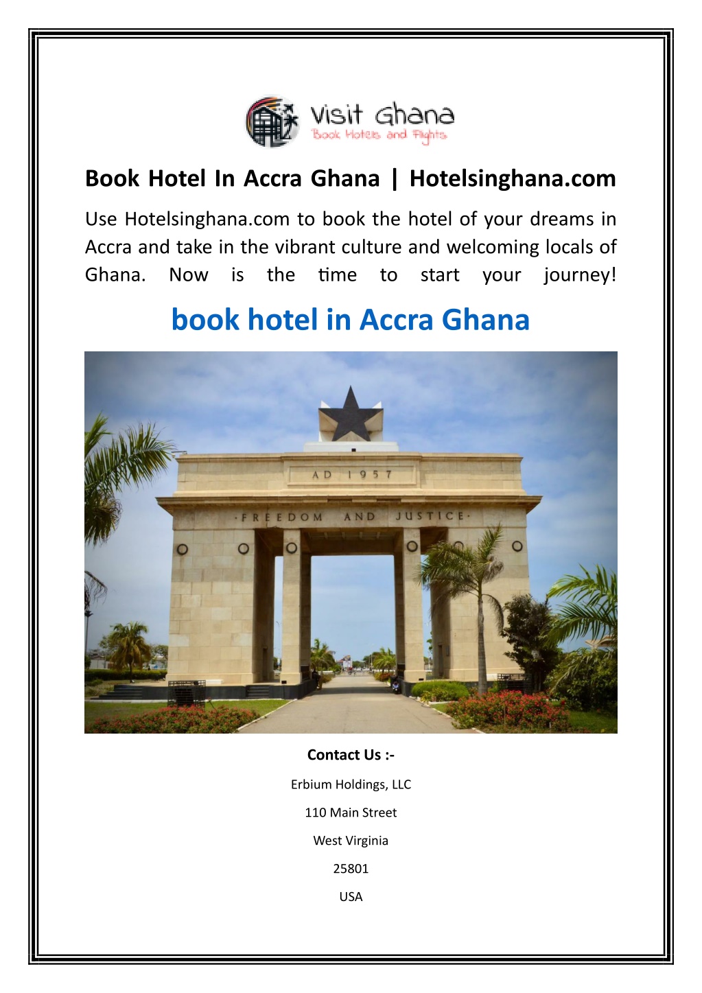 Book Hotel In Accra Ghana | Hotelsinghana.com Use Hotelsinghana.com to book the hotel of your dreams in Accra and take in the vibrant culture and welcoming locals of Ghana. Now is the time to start your journey! book hotel in Accra Ghana Contact Us :- Erbium Holdings, LLC 110 Main Street West Virginia 25801 USA