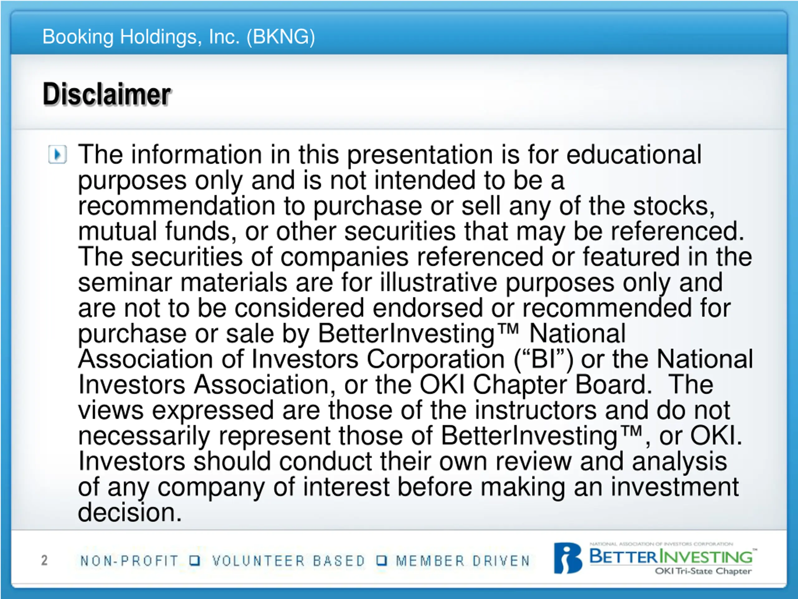 Booking Holdings, Inc. (BKNG) Disclaimer The information in this presentation is for educational purposes only and is not intended to be a recommendation to purchase or sell any of the stocks, mutual funds, or other securities that may be referenced. The securities of companies referenced or featured in the seminar materials are for illustrative purposes only and are not to be considered endorsed or recommended for purchase or sale by BetterInvesting Association of Investors Corporation ( BI ) or the National Investors Association, or the OKI Chapter Board. The views expressed are those of the instructors and do not necessarily represent those of BetterInvesting Investors should conduct their own review and analysis of any company of interest before making an investment decision. National , or OKI. 2