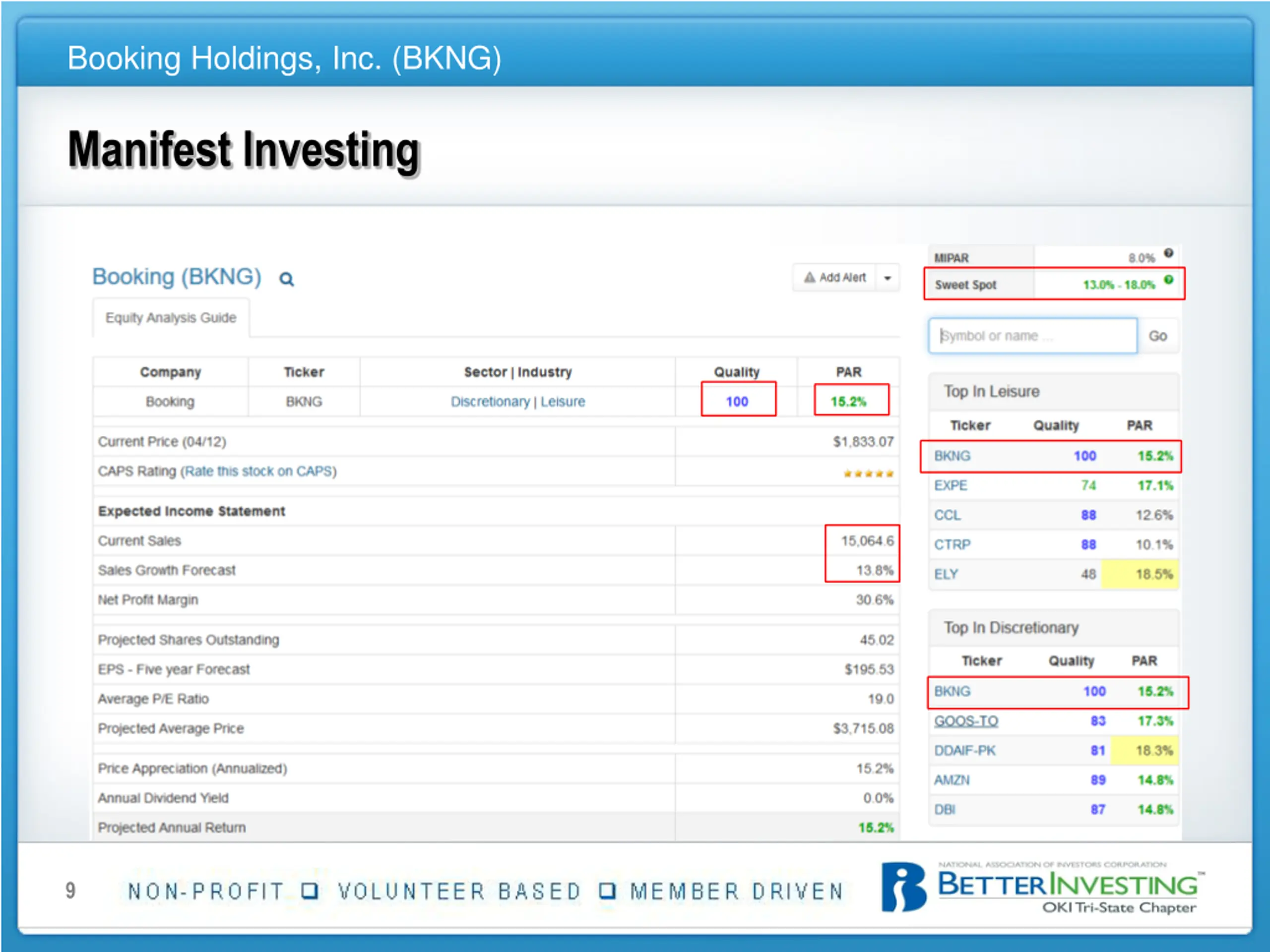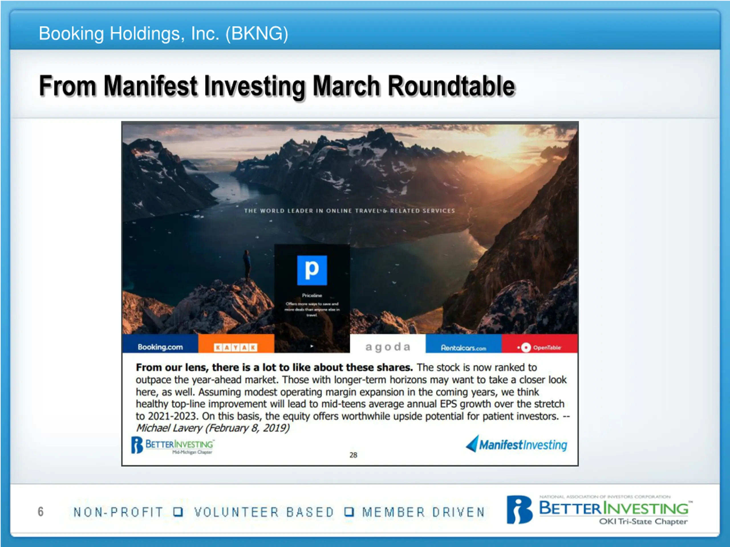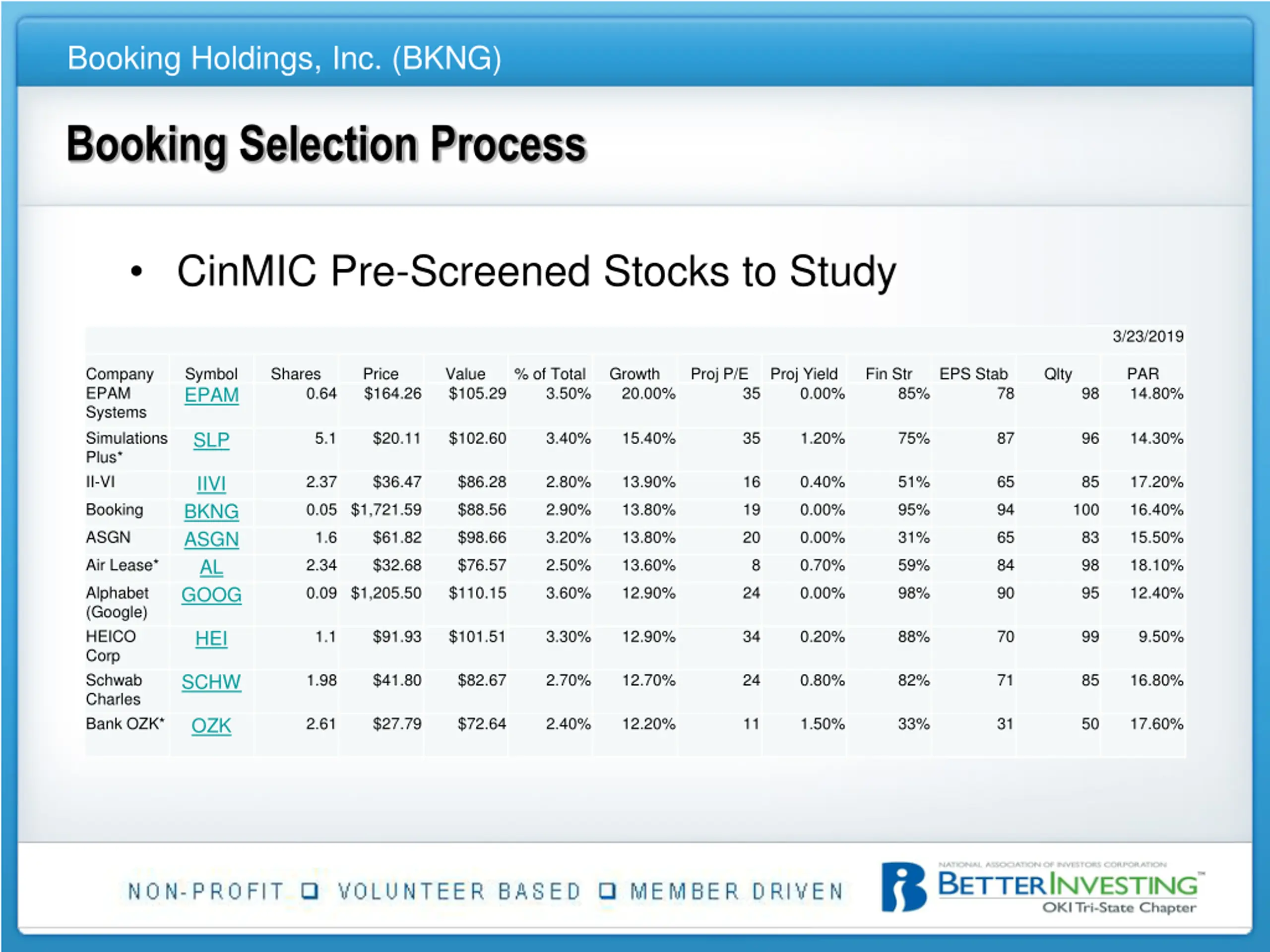 Booking Holdings, Inc. (BKNG) Booking Selection Process CinMIC Pre-Screened Stocks to Study Better Investing SSG Manifest Investing March 2019 Round Table Manifest Investing Dashboard Ann Cuneaz First Cut Aug 14, 2018 Investor Advisory Service - April 2019