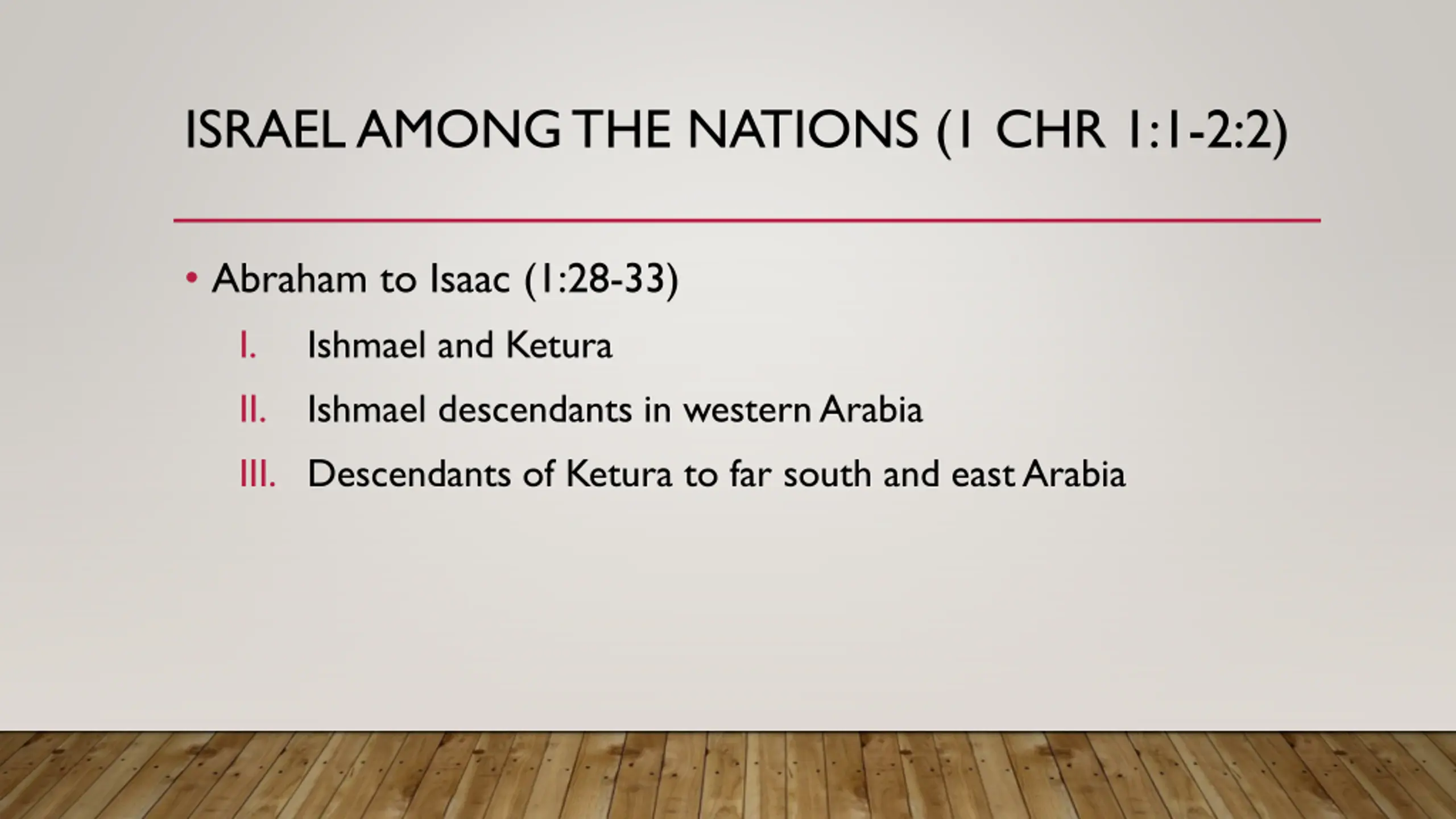 ISRAEL AMONG THE NATIONS (1 CHR 1:1-2:2) Abraham to Isaac (1:28-33) I. Ishmael and Ketura II. Ishmael descendants in western Arabia III. Descendants of Ketura to far south and east Arabia