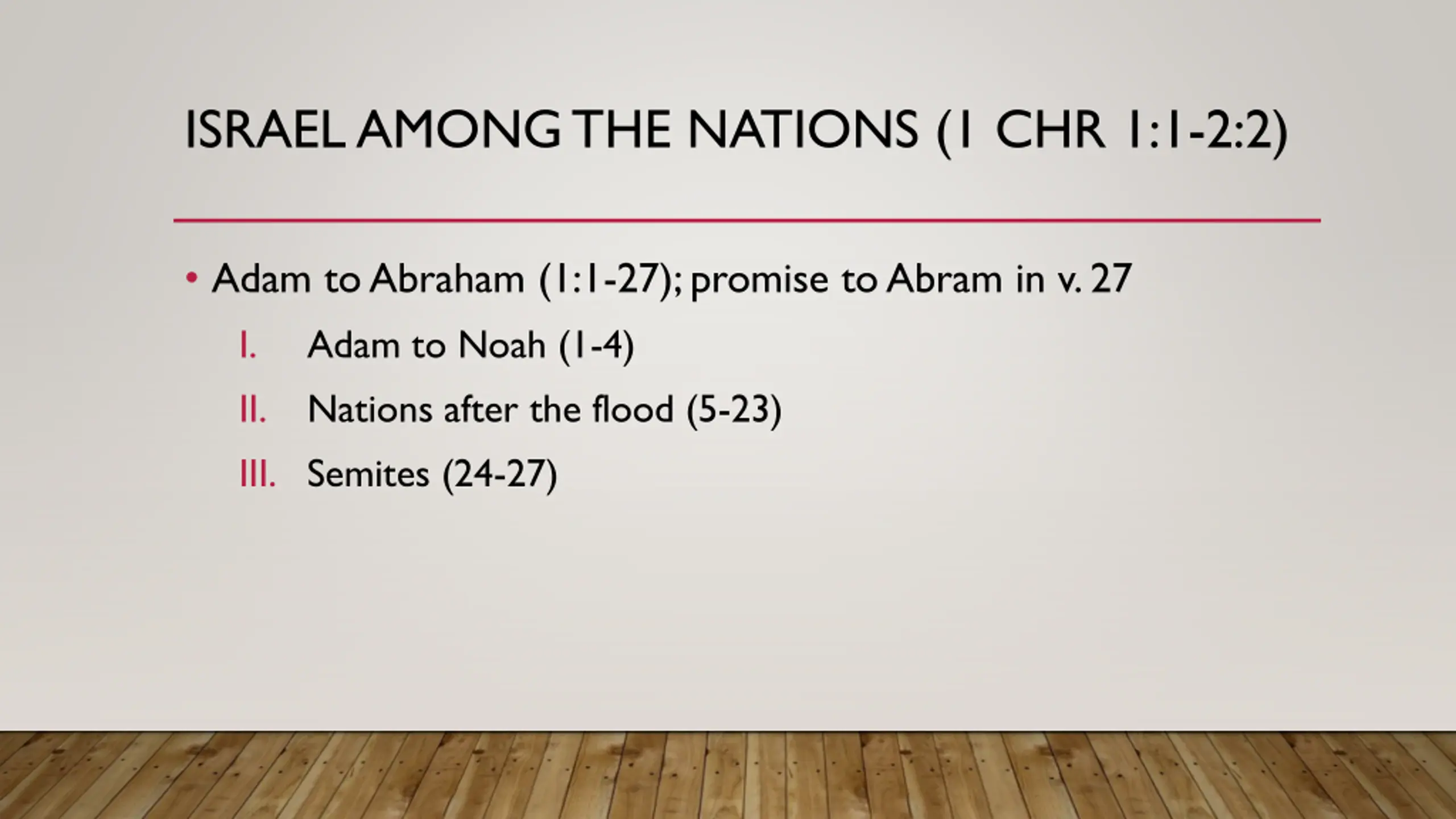 ISRAEL AMONG THE NATIONS (1 CHR 1:1-2:2) Adam to Abraham (1:1-27); promise to Abram in v. 27 I. Adam to Noah (1-4) II. Nations after the flood (5-23) III. Semites (24-27)