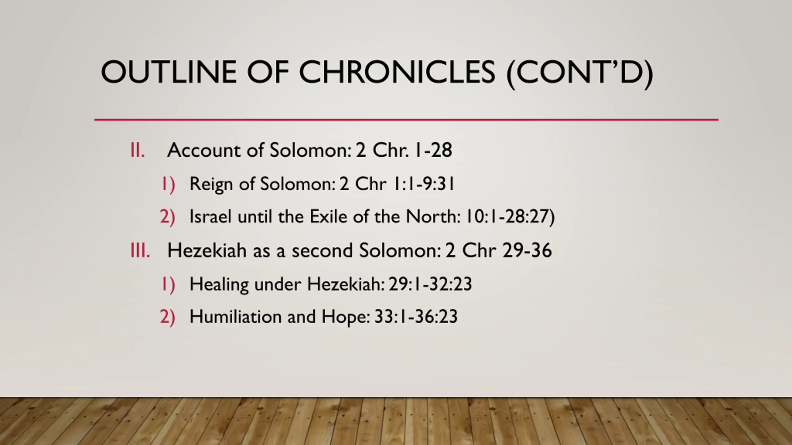 OUTLINE OF CHRONICLES (CONTD) II. Account of Solomon: 2 Chr. 1-28 1) Reign of Solomon: 2 Chr 1:1-9:31 2) Israel until the Exile of the North: 10:1-28:27) III. Hezekiah as a second Solomon: 2 Chr 29-36 1) Healing under Hezekiah: 29:1-32:23 2) Humiliation and Hope: 33:1-36:23