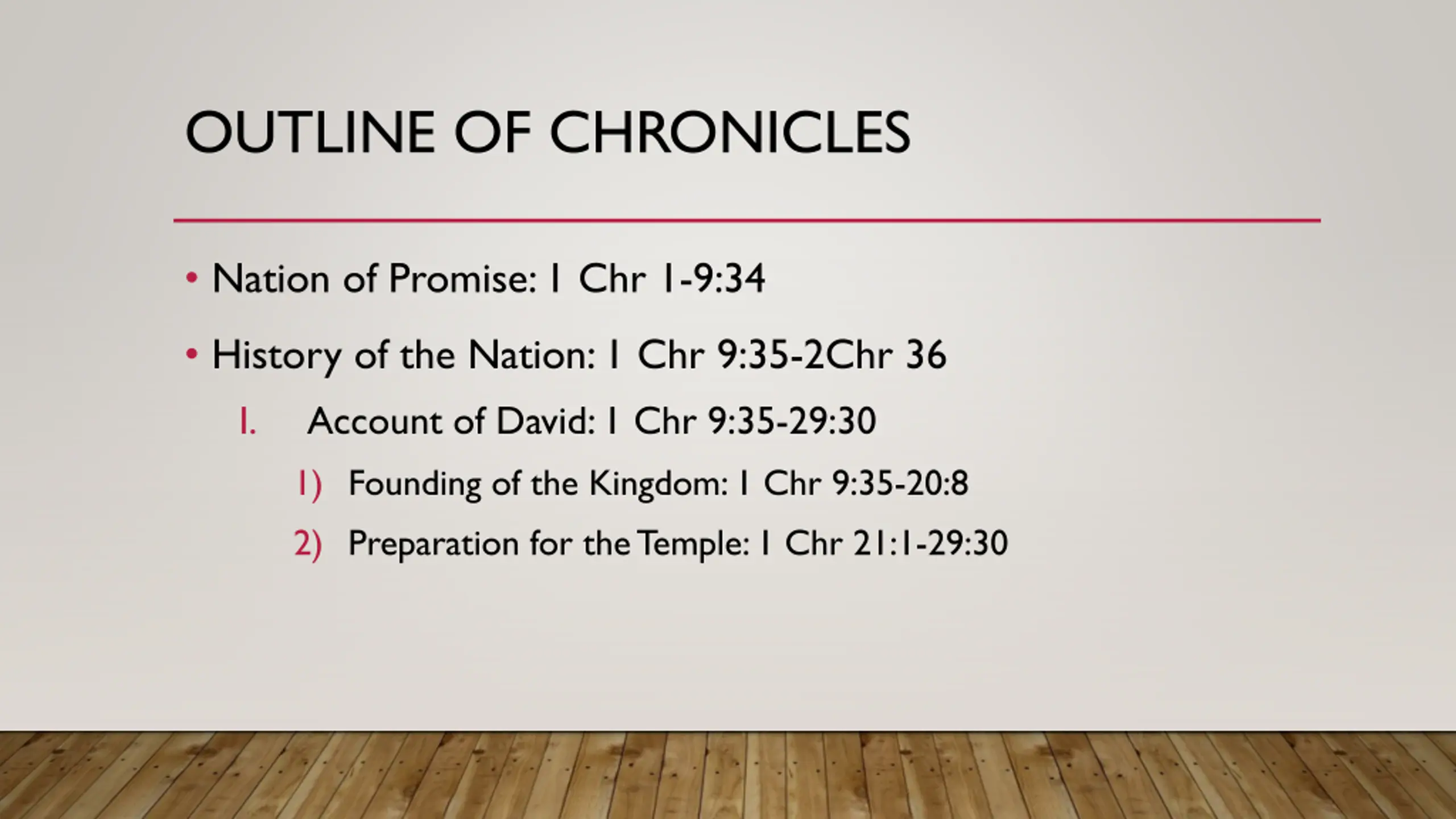 OUTLINE OF CHRONICLES Nation of Promise: 1 Chr 1-9:34 History of the Nation: 1 Chr 9:35-2Chr 36 I. Account of David: 1 Chr 9:35-29:30 1) Founding of the Kingdom: 1 Chr 9:35-20:8 2) Preparation for the Temple: 1 Chr 21:1-29:30