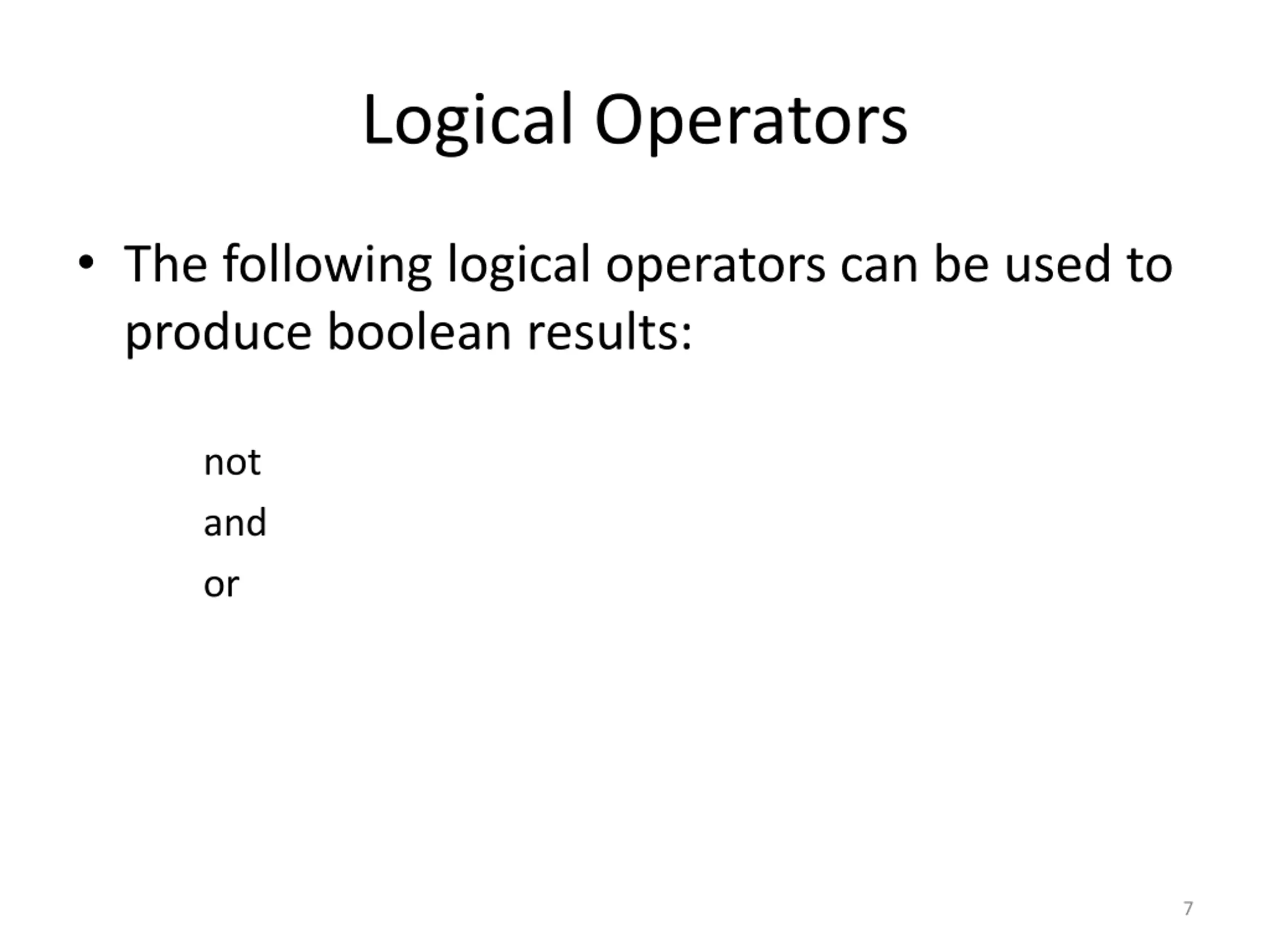 Logical Operators The following logical operators can be used to produce boolean results: not and or 7