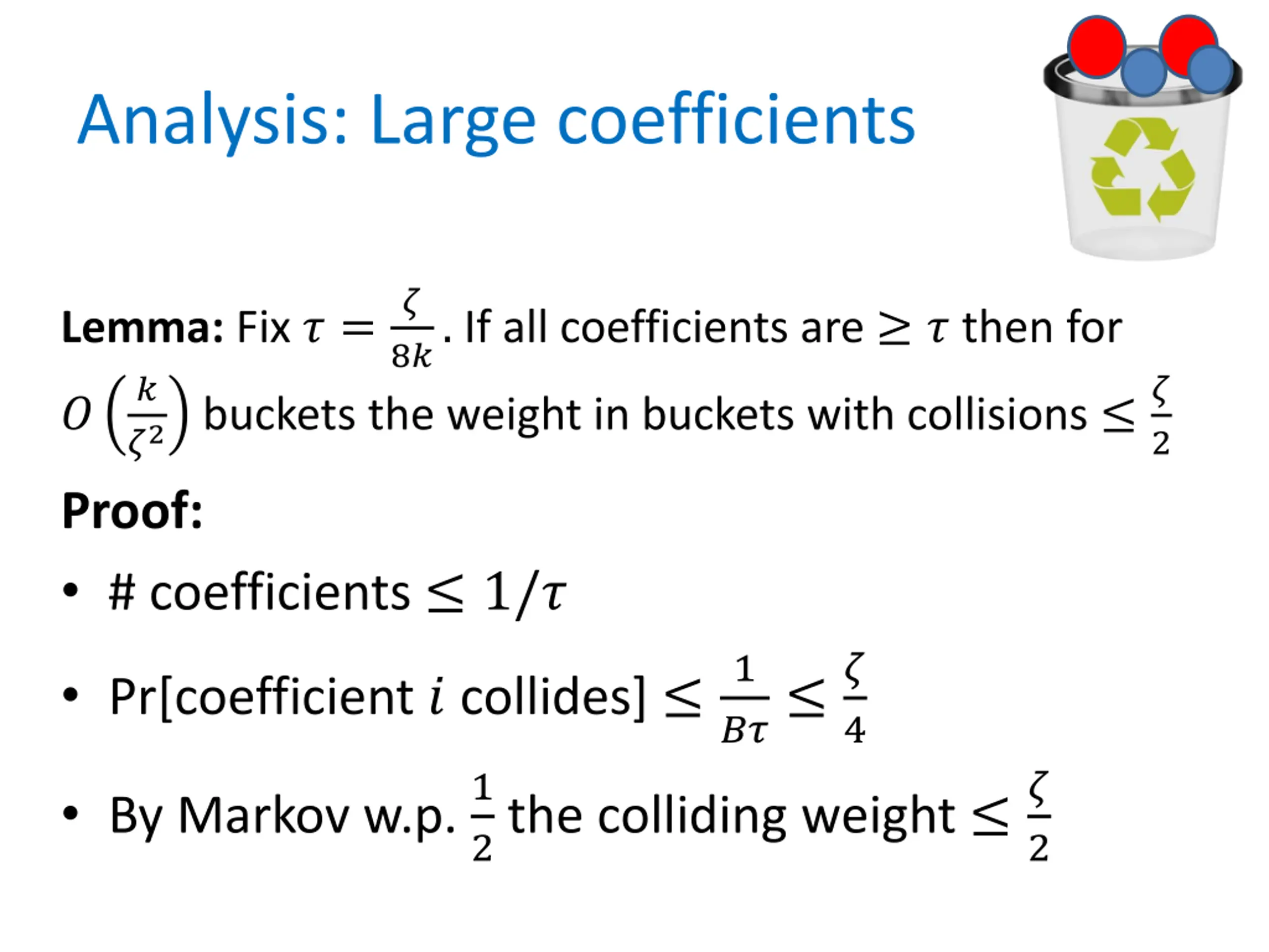Analysis: Large coefficients ? Lemma: Fix ? = 8?. If all coefficients are ? then for ?2 buckets the weight in buckets with collisions ? Proof: # coefficients 1/? ? ? 2 ?? ? 1 Pr[coefficient ? collides] 4 By Markov w.p. 1 2 the colliding weight ? 2