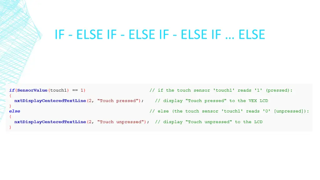 IF - ELSE IF - ELSE IF - ELSE IF ELSE Multiple, different condition checks can be incorporated into a single control structure with else if statements : if ( check first condition ) else if ( if the first condition is false, check second condition ) else if ( if the second condition is false, check third condition ) else ( if all conditions are false, run the code within this else ) Take note that these statements and the code within them should be mutually exclusive they will NOT work at the same time if forced to. If you are using multiple buttons to control multiple motors, as with the previous example, use an if-statement structure for each motor.