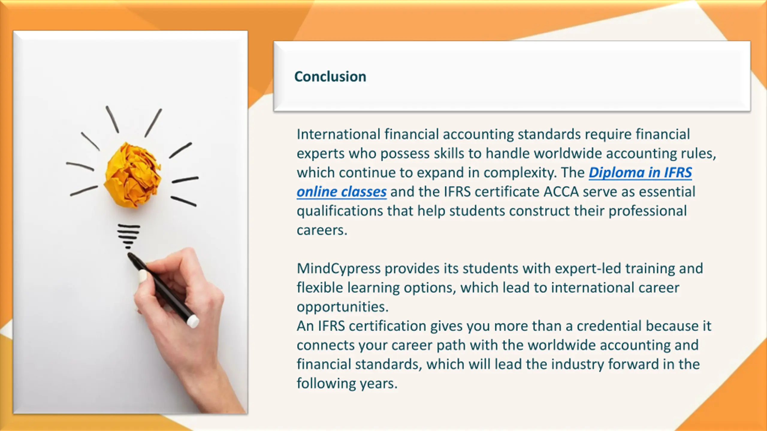 Conclusion International financial accounting standards require financial experts who possess skills to handle worldwide accounting rules, which continue to expand in complexity. The Diploma in IFRS online classes and the IFRS certificate ACCA serve as essential qualifications that help students construct their professional careers. MindCypress provides its students with expert-led training and flexible learning options, which lead to international career opportunities. An IFRS certification gives you more than a credential because it connects your career path with the worldwide accounting and financial standards, which will lead the industry forward in the following years.