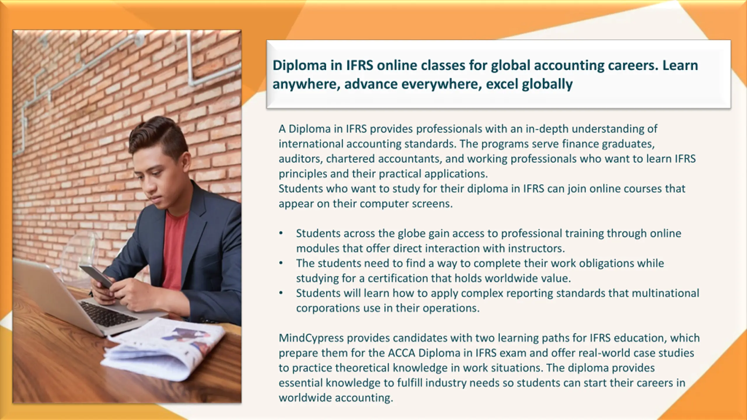 Diploma in IFRS online classes for global accounting careers. Learn anywhere, advance everywhere, excel globally A Diploma in IFRS provides professionals with an in-depth understanding of international accounting standards. The programs serve finance graduates, auditors, chartered accountants, and working professionals who want to learn IFRS principles and their practical applications. Students who want to study for their diploma in IFRS can join online courses that appear on their computer screens. Students across the globe gain access to professional training through online modules that offer direct interaction with instructors. The students need to find a way to complete their work obligations while studying for a certification that holds worldwide value. Students will learn how to apply complex reporting standards that multinational corporations use in their operations. MindCypress provides candidates with two learning paths for IFRS education, which prepare them for the ACCA Diploma in IFRS exam and offer real-world case studies to practice theoretical knowledge in work situations. The diploma provides essential knowledge to fulfill industry needs so students can start their careers in worldwide accounting.