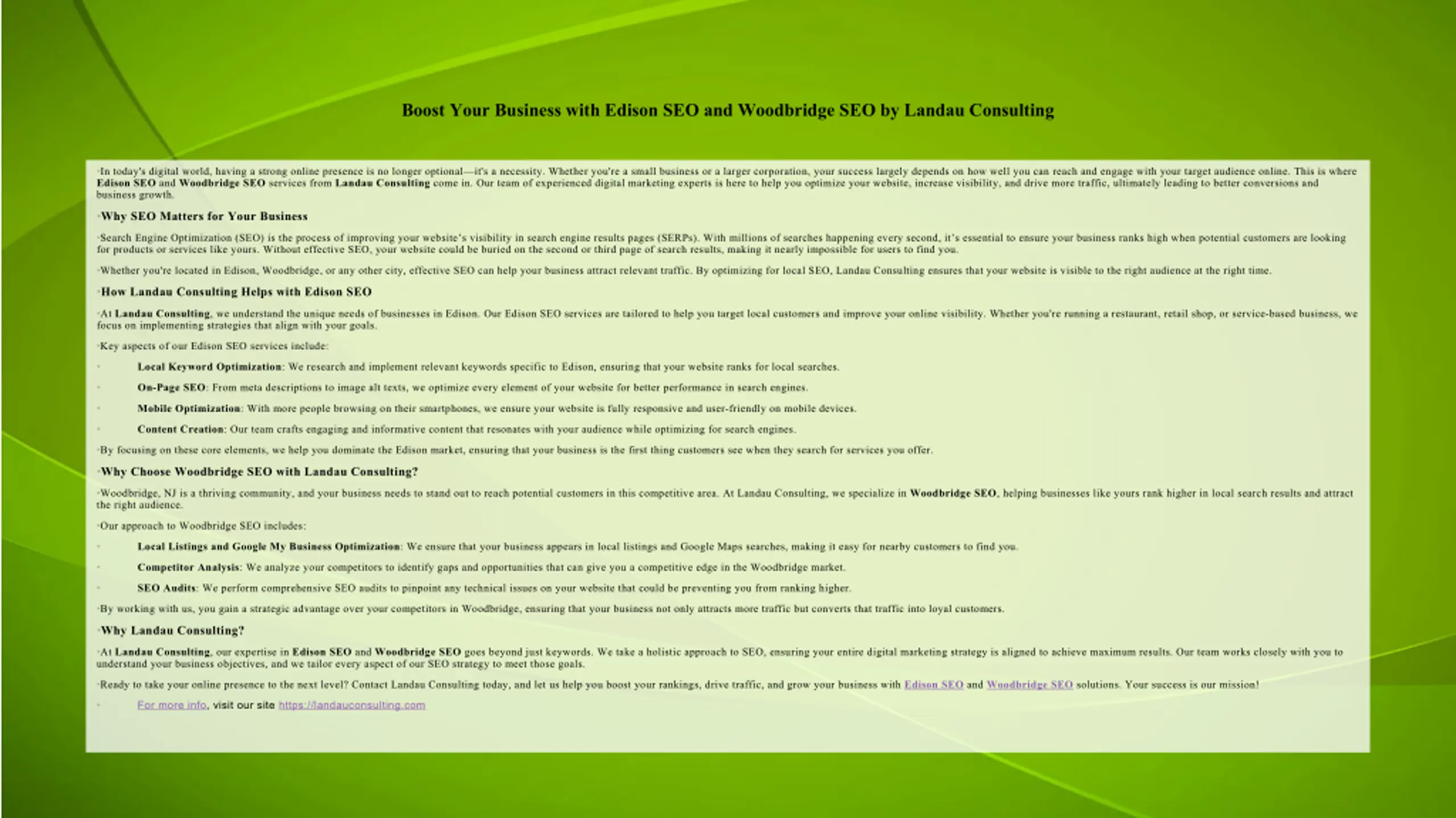 Boost Your Business with Edison SEO and Woodbridge SEO by Landau Consulting In today's digital world, having a strong online presence is no longer optional it's a necessity. Whether you're a small business or a larger corporation, your success largely depends on how well you can reach and engage with your target audience online. This is where Edison SEO and Woodbridge SEO services from Landau Consulting come in. Our team of experienced digital marketing experts is here to help you optimize your website, increase visibility, and drive more traffic, ultimately leading to better conversions and business growth. Why SEO Matters for Your Business Search Engine Optimization (SEO) is the process of improving your website s visibility in search engine results pages (SERPs). With millions of searches happening every second, it s essential to ensure your business ranks high when potential customers are looking for products or services like yours. Without effective SEO, your website could be buried on the second or third page of search results, making it nearly impossible for users to find you. Whether you're located in Edison, Woodbridge, or any other city, effective SEO can help your business attract relevant traffic. By optimizing for local SEO, Landau Consulting ensures that your website is visible to the right audience at the right time. How Landau Consulting Helps with Edison SEO At Landau Consulting, we understand the unique needs of businesses in Edison. Our Edison SEO services are tailored to help you target local customers and improve your online visibility. Whether you're running a restaurant, retail shop, or service-based business, we focus on implementing strategies that align with your goals. Key aspects of our Edison SEO services include: Local Keyword Optimization: We research and implement relevant keywords specific to Edison, ensuring that your website ranks for local searches. On-Page SEO: From meta descriptions to image alt texts, we optimize every element of your website for better performance in search engines. Mobile Optimization: With more people browsing on their smartphones, we ensure your website is fully responsive and user-friendly on mobile devices. Content Creation: Our team crafts engaging and informative content that resonates with your audience while optimizing for search engines. By focusing on these core elements, we help you dominate the Edison market, ensuring that your business is the first thing customers see when they search for services you offer. Why Choose Woodbridge SEO with Landau Consulting? Woodbridge, NJ is a thriving community, and your business needs to stand out to reach potential customers in this competitive area. At Landau Consulting, we specialize in Woodbridge SEO, helping businesses like yours rank higher in local search results and attract the right audience. Our approach to Woodbridge SEO includes: Local Listings and Google My Business Optimization: We ensure that your business appears in local listings and Google Maps searches, making it easy for nearby customers to find you. Competitor Analysis: We analyze your competitors to identify gaps and opportunities that can give you a competitive edge in the Woodbridge market. SEO Audits: We perform comprehensive SEO audits to pinpoint any technical issues on your website that could be preventing you from ranking higher. By working with us, you gain a strategic advantage over your competitors in Woodbridge, ensuring that your business not only attracts more traffic but converts that traffic into loyal customers. Why Landau Consulting? At Landau Consulting, our expertise in Edison SEO and Woodbridge SEO goes beyond just keywords. We take a holistic approach to SEO, ensuring your entire digital marketing strategy is aligned to achieve maximum results. Our team works closely with you to understand your business objectives, and we tailor every aspect of our SEO strategy to meet those goals. Ready to take your online presence to the next level? Contact Landau Consulting today, and let us help you boost your rankings, drive traffic, and grow your business with Edison SEO and Woodbridge SEO solutions. Your success is our mission! For more info, visit our site https://landauconsulting.com