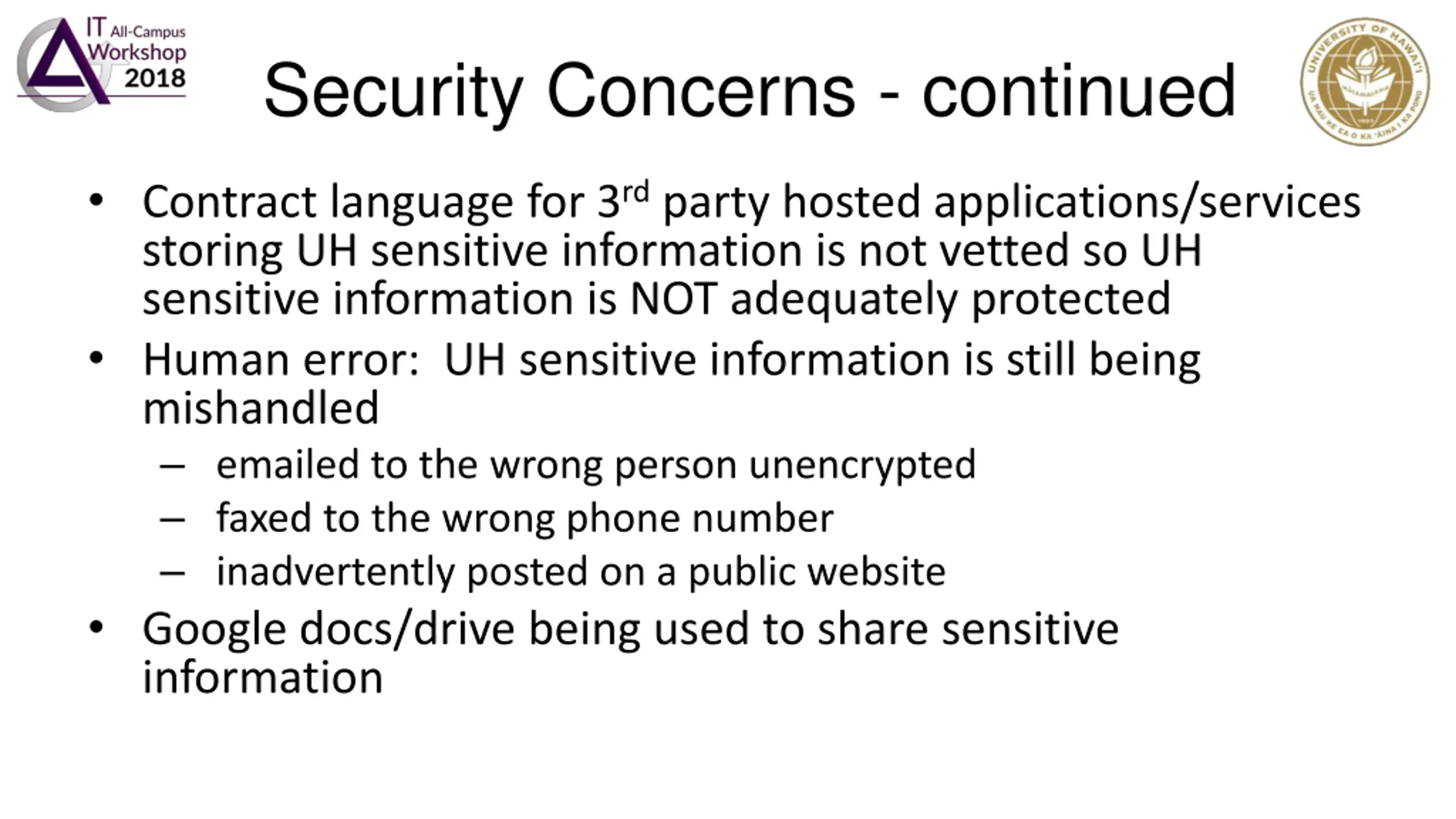 Security Concerns - continued Contract language for 3rd party hosted applications/services storing UH sensitive information is not vetted so UH sensitive information is NOT adequately protected Human error: UH sensitive information is still being mishandled emailed to the wrong person unencrypted faxed to the wrong phone number inadvertently posted on a public website Google docs/drive being used to share sensitive information