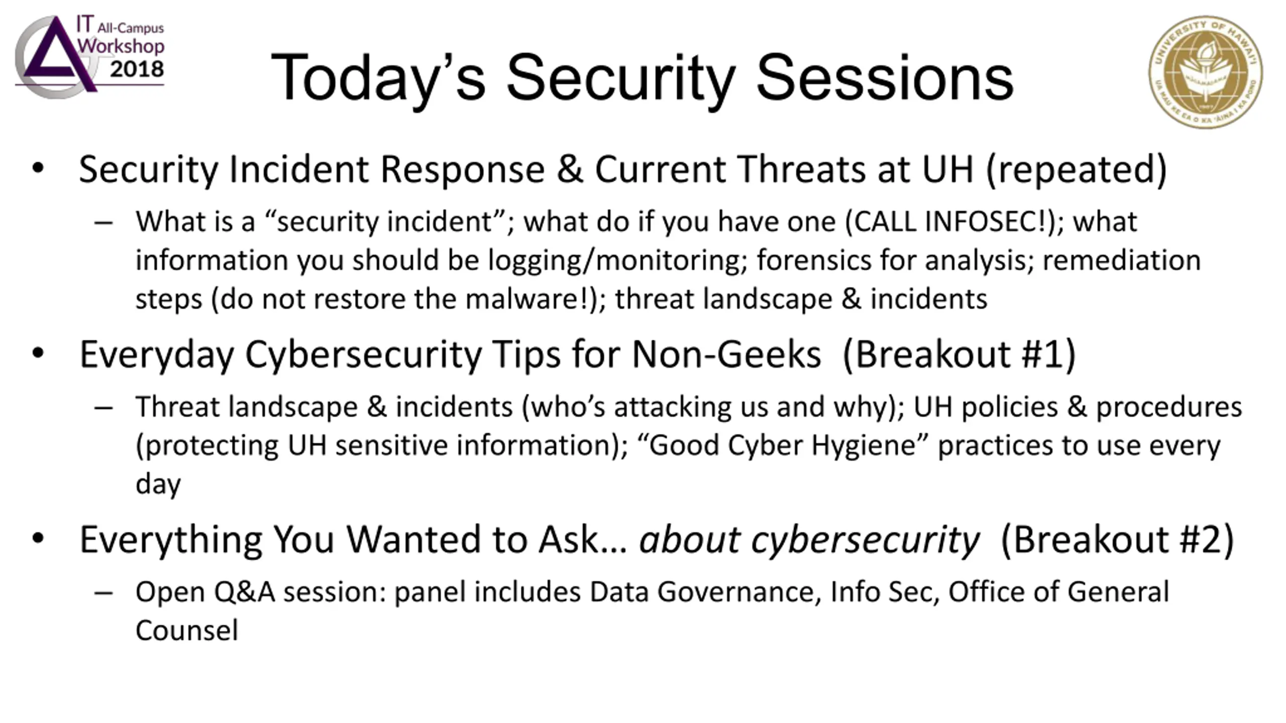 Todays Security Sessions Security Incident Response & Current Threats at UH (repeated) What is a security incident ; what do if you have one (CALL INFOSEC!); what information you should be logging/monitoring; forensics for analysis; remediation steps (do not restore the malware!); threat landscape & incidents Everyday Cybersecurity Tips for Non-Geeks (Breakout #1) Threat landscape & incidents (who s attacking us and why); UH policies & procedures (protecting UH sensitive information); Good Cyber Hygiene practices to use every day Everything You Wanted to Ask about cybersecurity (Breakout #2) Open Q&A session: panel includes Data Governance, Info Sec, Office of General Counsel