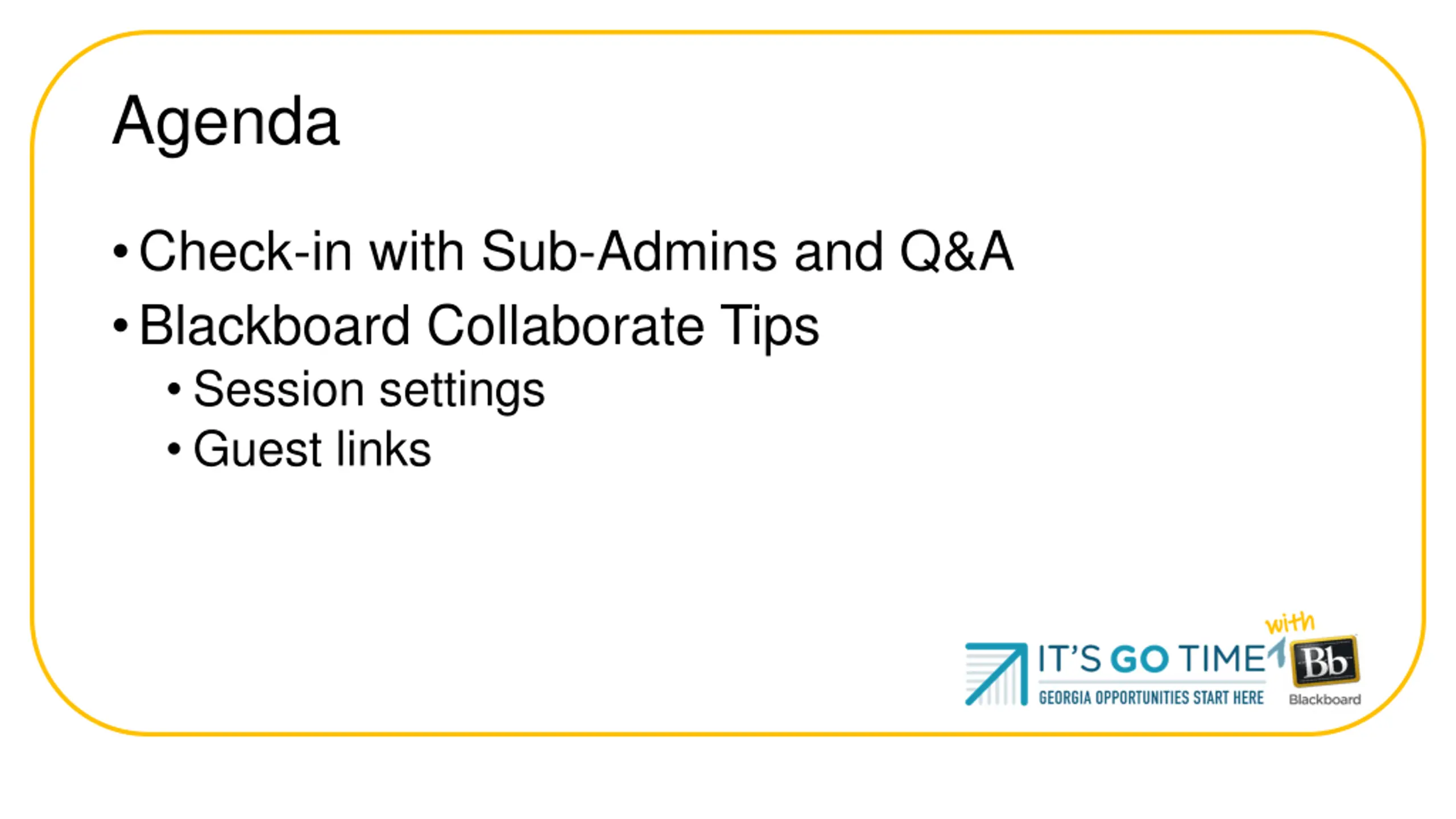 Agenda Check-in with Sub-Admins and Q&A Blackboard Collaborate Tips Session settings Guest links