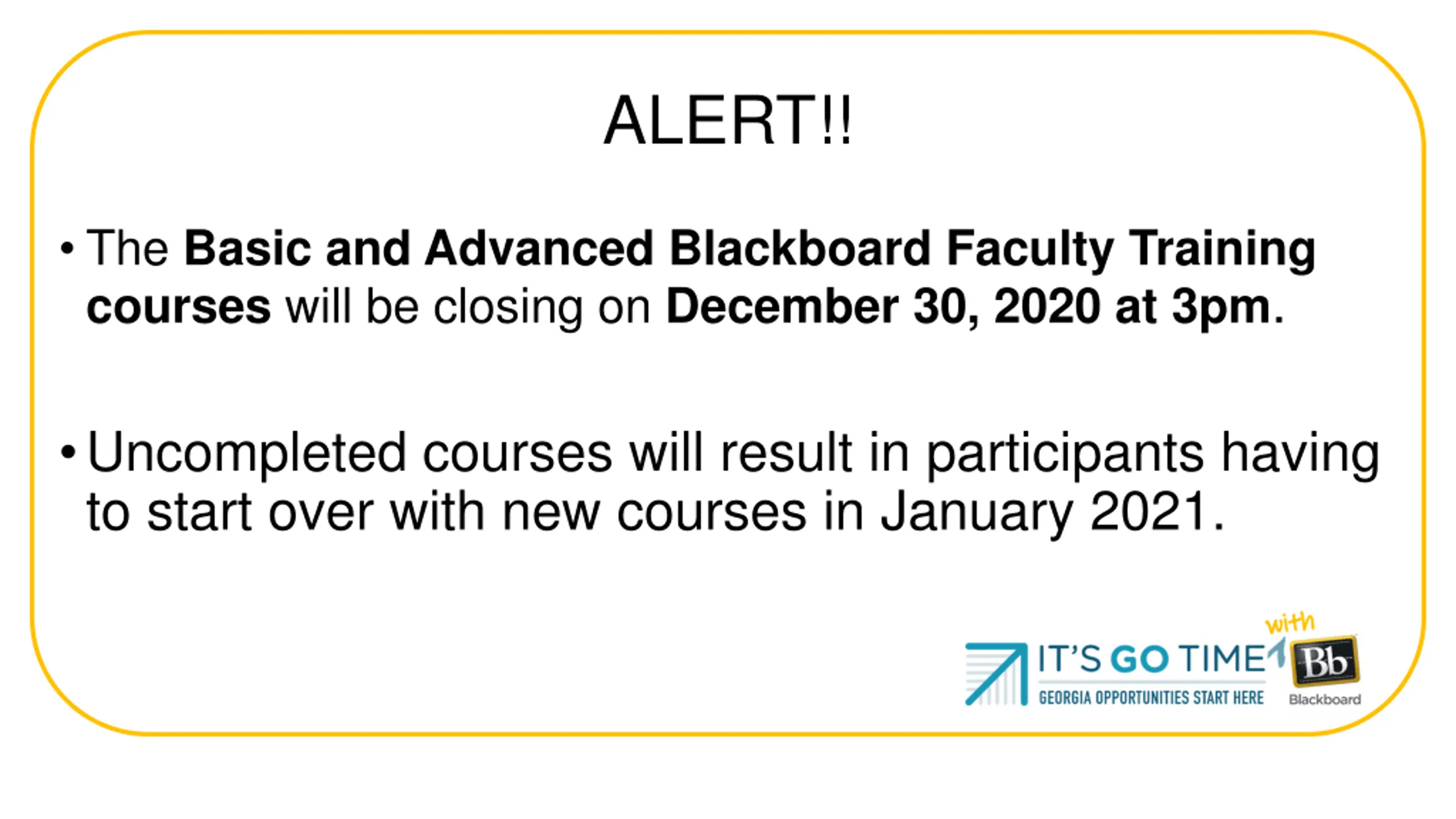 ALERT!! The Basic and Advanced Blackboard Faculty Training courses will be closing on December 30, 2020 at 3pm. Uncompleted courses will result in participants having to start over with new courses in January 2021.