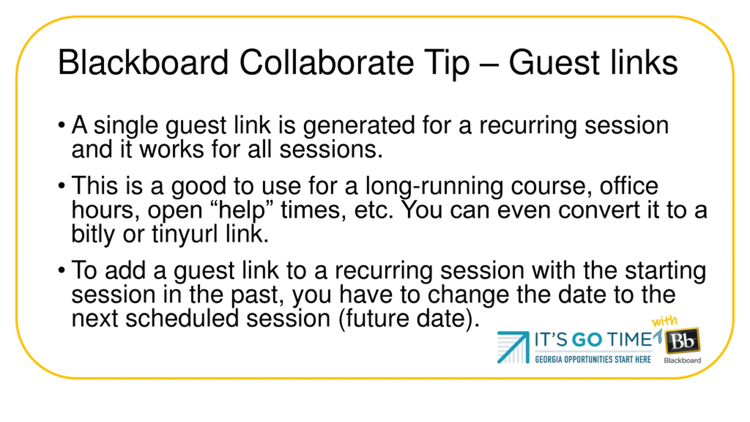 Blackboard Collaborate Tip Guest links A single guest link is generated for a recurring session and it works for all sessions. This is a good to use for a long-running course, office hours, open help times, etc. You can even convert it to a bitly or tinyurl link. To add a guest link to a recurring session with the starting session in the past, you have to change the date to the next scheduled session (future date).