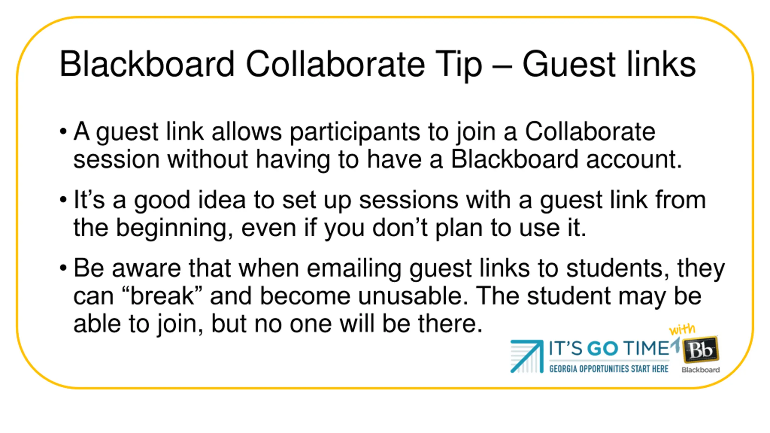 Blackboard Collaborate Tip Guest links A guest link allows participants to join a Collaborate session without having to have a Blackboard account. It s a good idea to set up sessions with a guest link from the beginning, even if you don t plan to use it. Be aware that when emailing guest links to students, they can break and become unusable. The student may be able to join, but no one will be there.