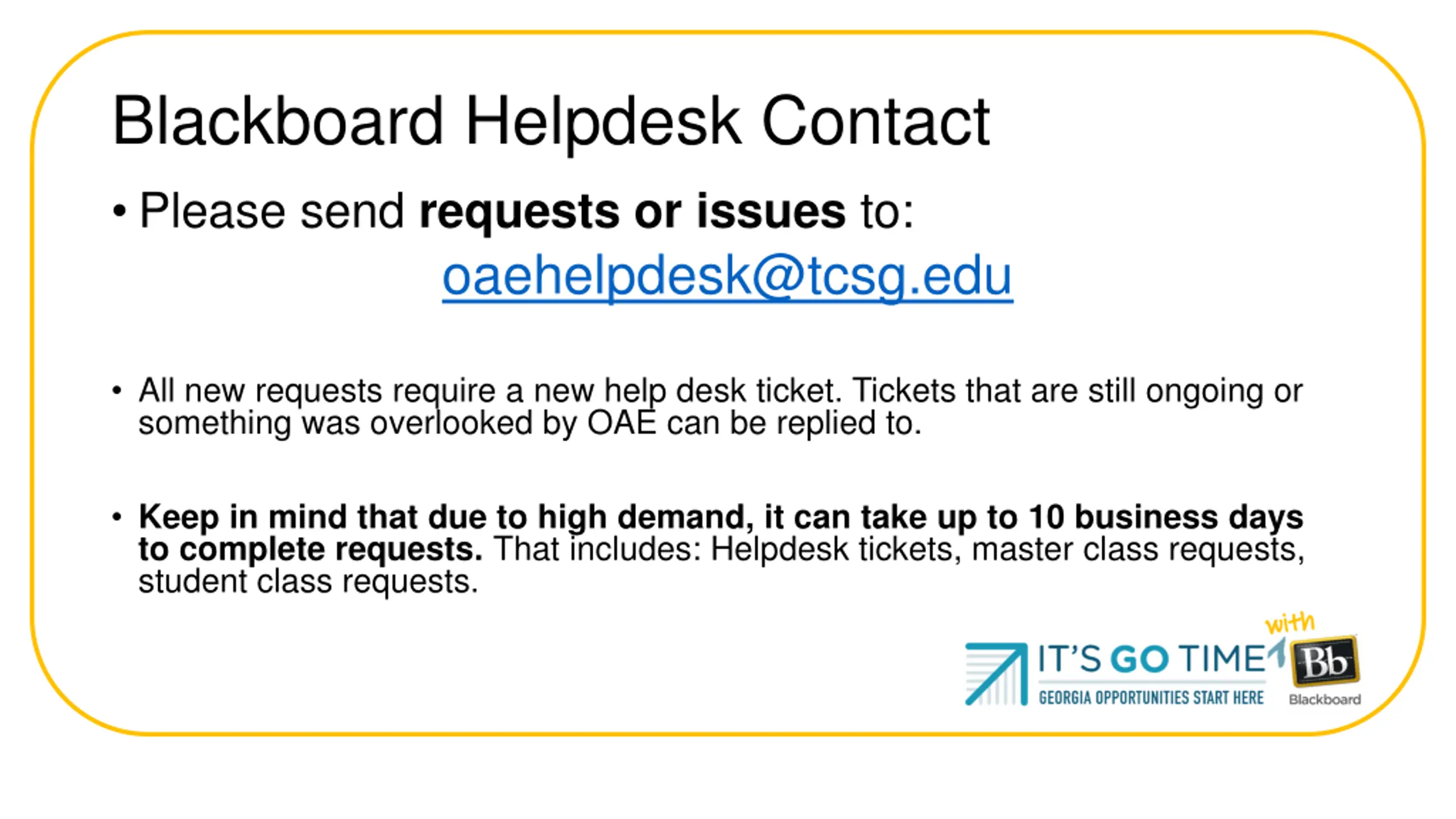Blackboard Helpdesk Contact Pleasesend requests or issues to: oaehelpdesk@tcsg.edu All new requests require a new help desk ticket. Tickets that are still ongoing or something was overlooked by OAE can be replied to. Keep in mind that due to high demand, it can take up to 10 business days to complete requests. That includes: Helpdesk tickets, master class requests, student class requests.