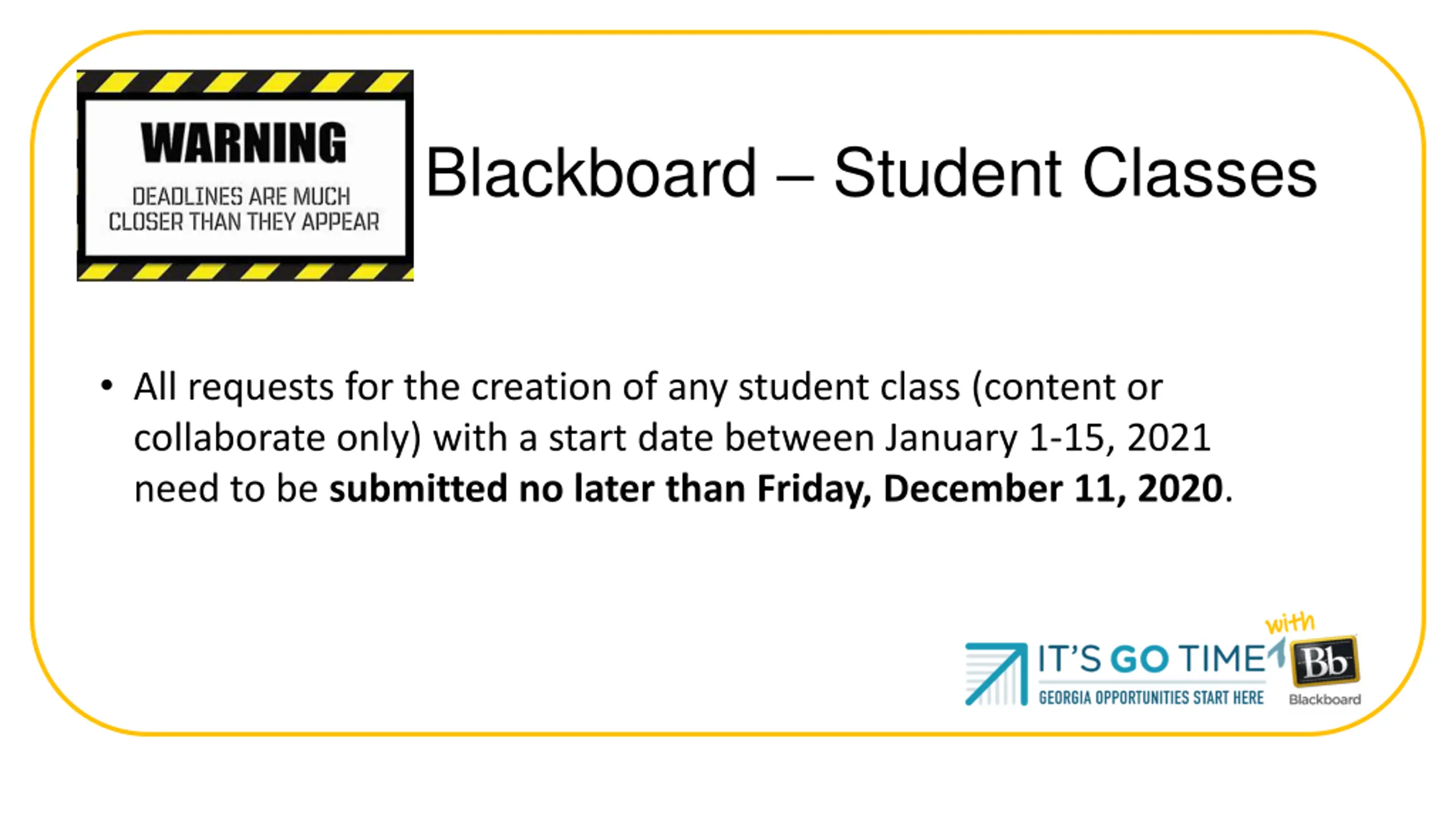 Blackboard Student Classes ests. All requests for the creation of any student class (content or collaborate only) with a start date between January 1-15, 2021 need to be submitted no later than Friday, December 11, 2020.