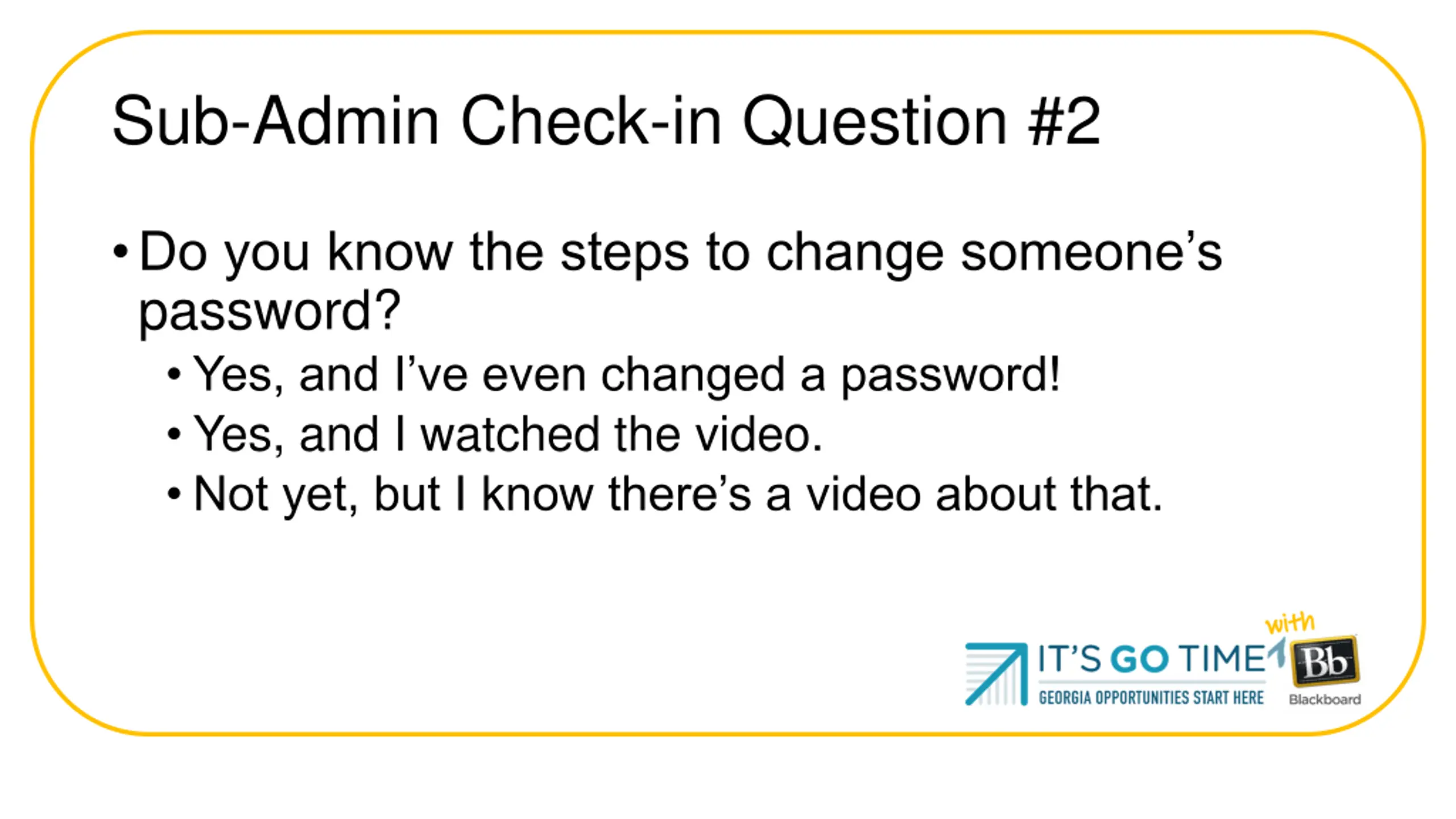 Sub-Admin Check-in Question #2 Do you know the steps to change someone s password? Yes, and I ve even changed a password! Yes, and I watched the video. Not yet, but I know there s a video about that.