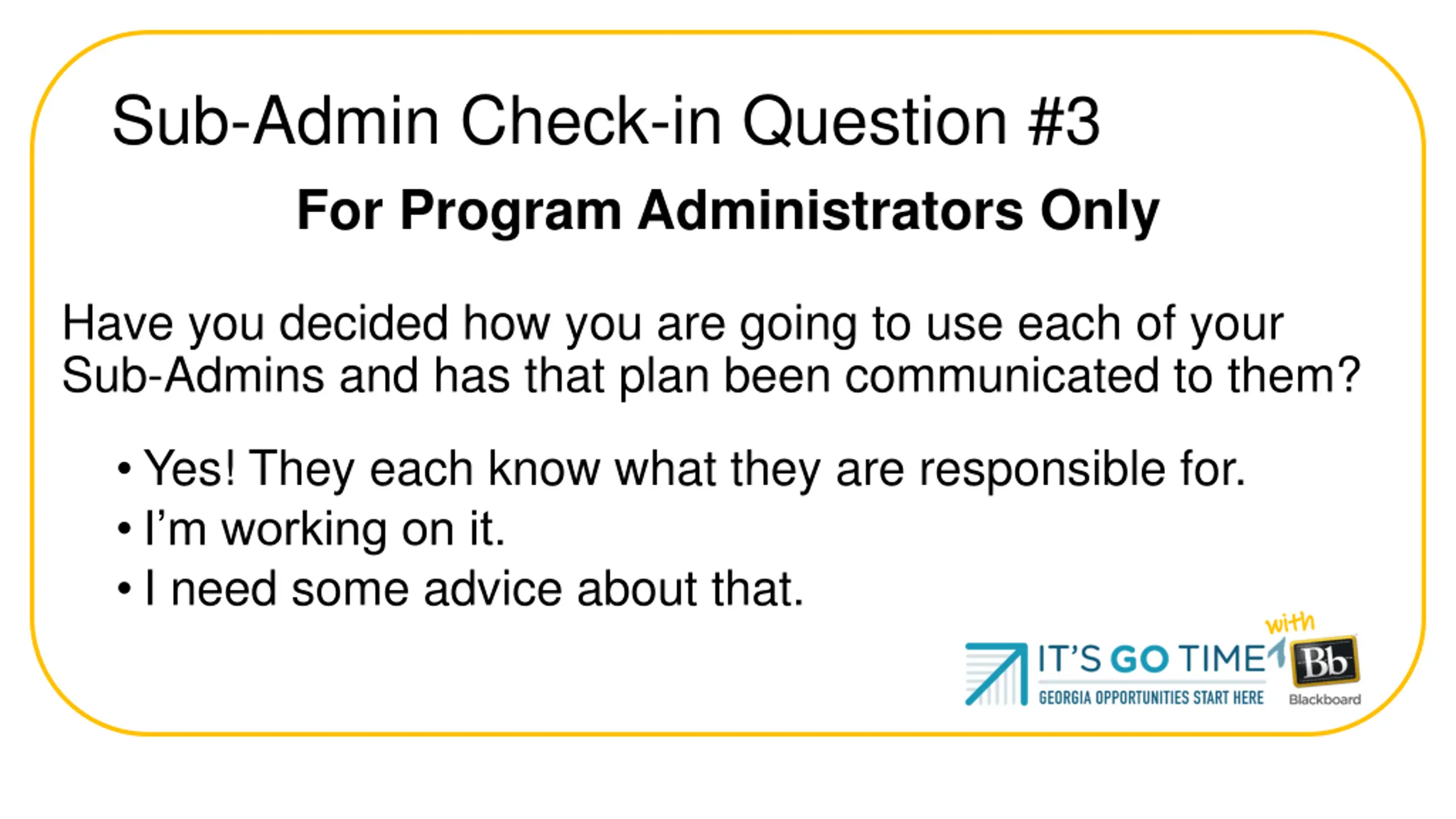 Sub-Admin Check-in Question #3 For Program Administrators Only Have you decided how you are going to use each of your Sub-Admins and has that plan been communicated to them? Yes! They each know what they are responsible for. I m working on it. I need some advice about that.