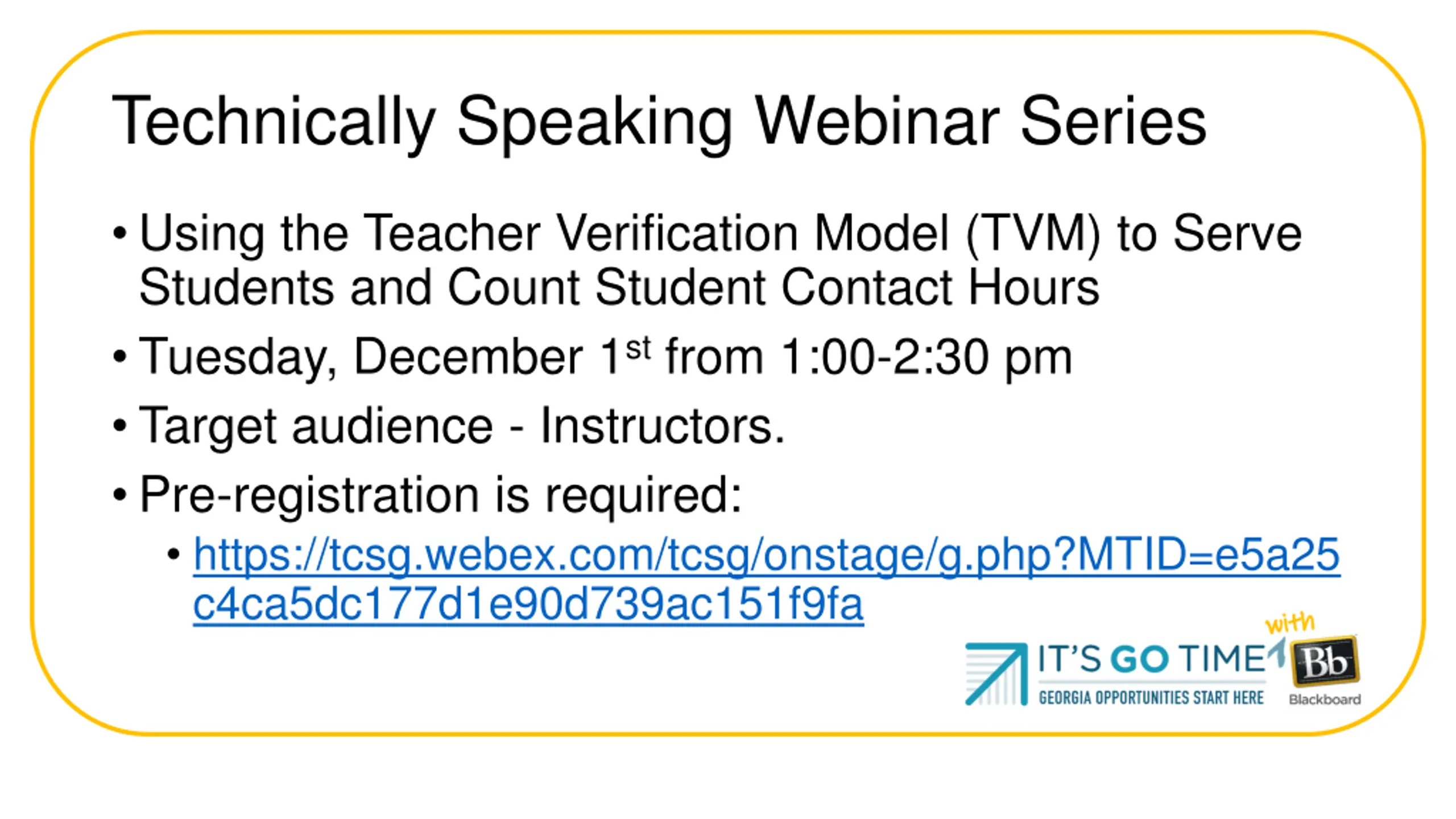 Technically Speaking Webinar Series Using the Teacher Verification Model (TVM) to Serve Students and Count Student Contact Hours Tuesday, December 1st from 1:00-2:30 pm Target audience - Instructors. Pre-registration is required: https://tcsg.webex.com/tcsg/onstage/g.php?MTID=e5a25 c4ca5dc177d1e90d739ac151f9fa