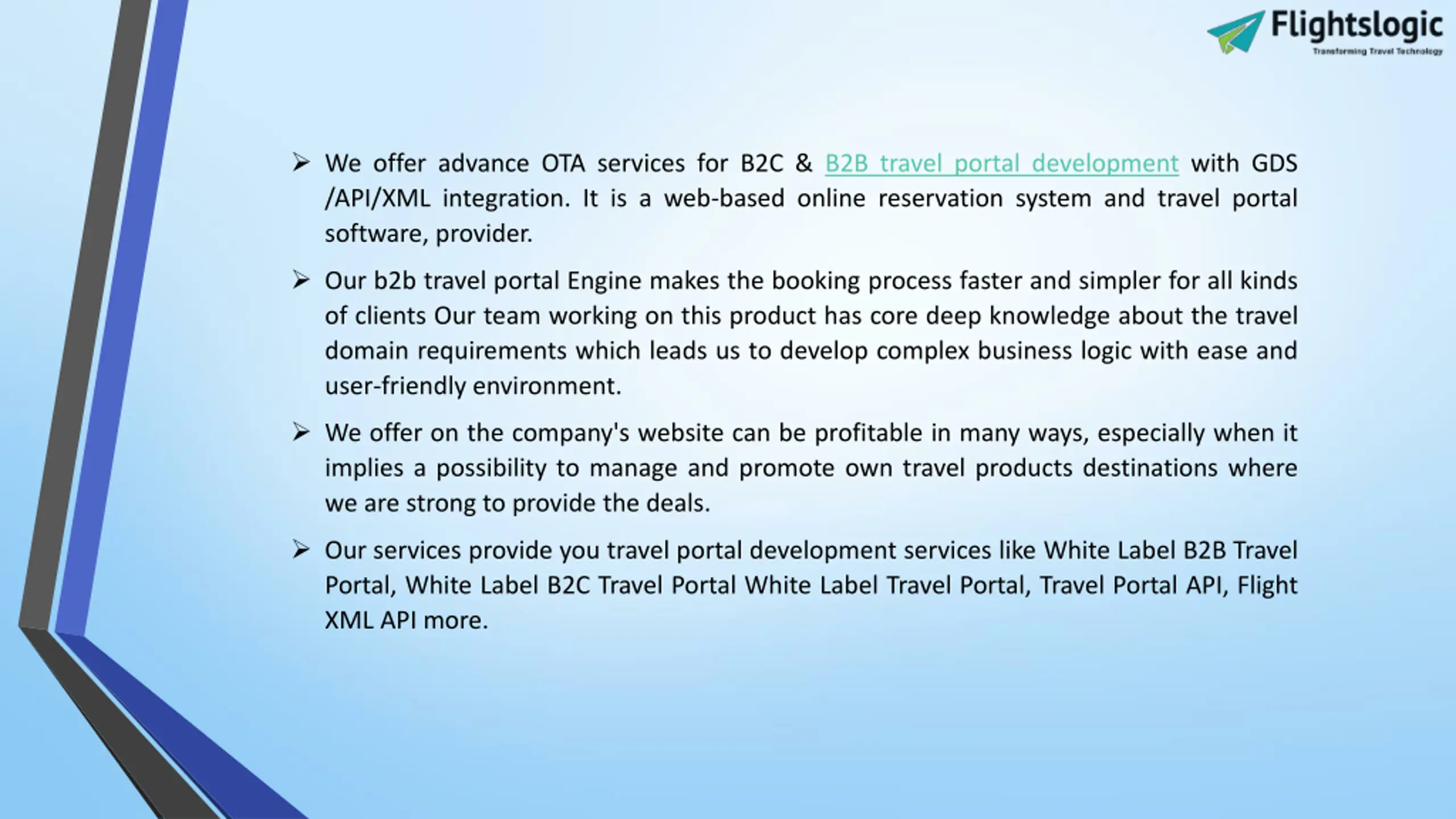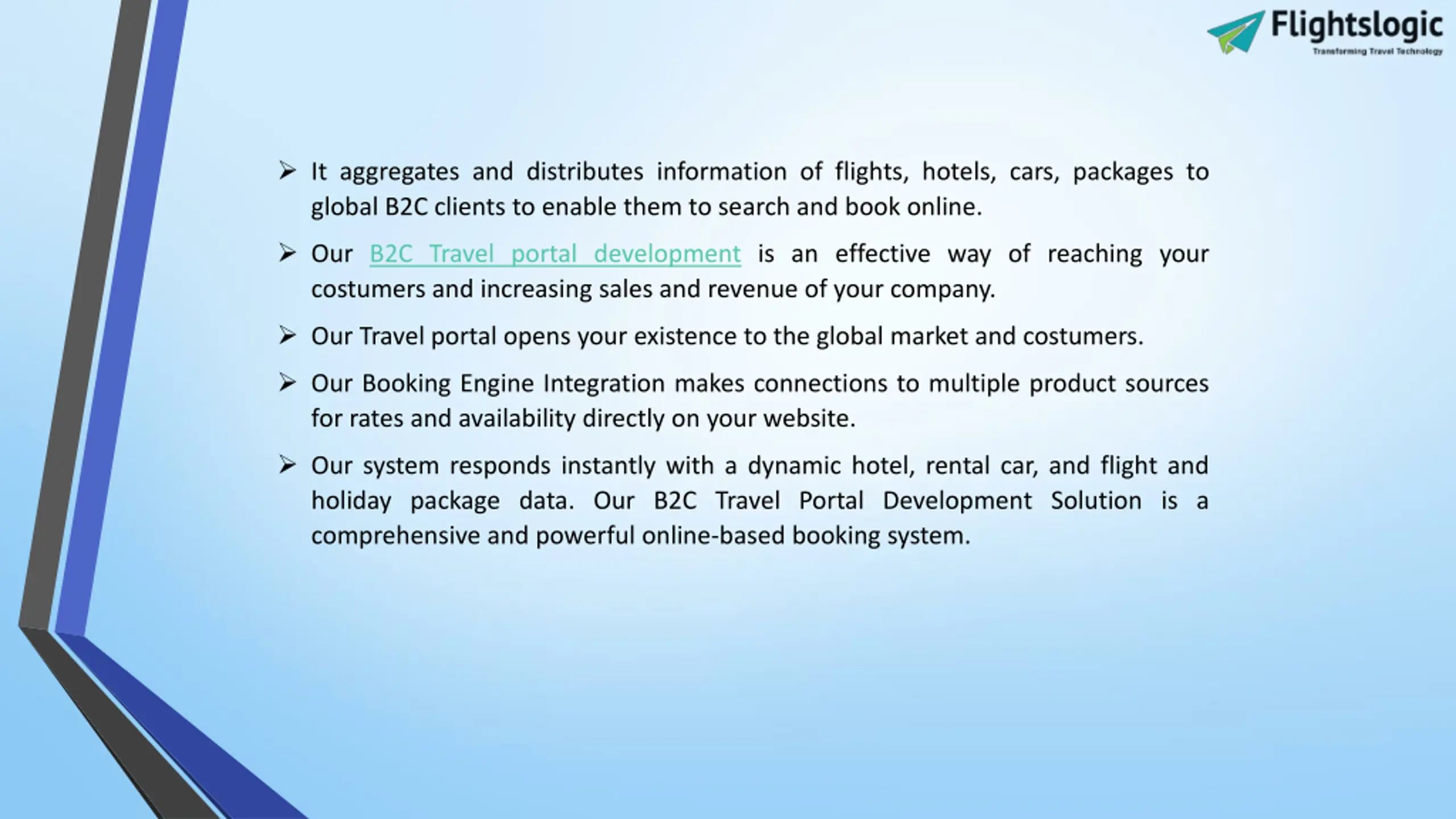 Sell Your Travel Products - Hotels, Flights & Tours with Absolute Features FlightsLogic is a Travel Portal Development Company that provides B2C Travel Portals to travel agencies, tour operators and travel companies worldwide. We offer you a B2C travel portal development solution which means business to the client. It will provide you a better turn around the ratio of customers. We offer B2C booking software that gives clients the ability to direct search, select and book tickets online. Our B2C travel portal is an online booking engine with flights, hotels, transfers, and sightseeing and packages modules.