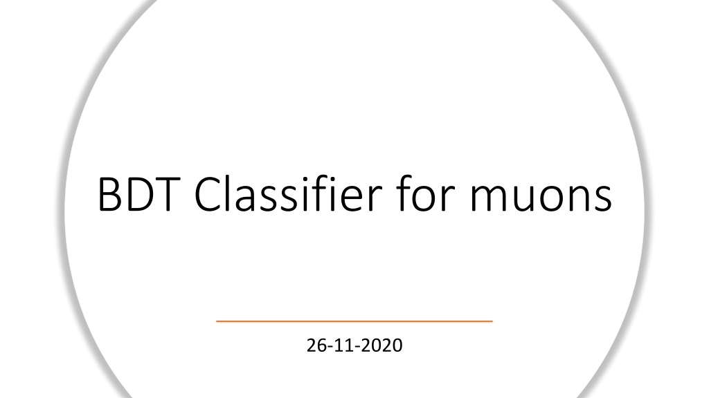 BDT classifier for muons Create a boosted decision tree that can separate muon hits from other hits 16789 CC and NC nu events (1.28x107mc hits, excluding cuts removing events with no muon) in the two ROOT files ARCA_GSGHE_nu12CC_muons.jsirene.jte.aashowerfit.root ARCA_GSGHE_nu12NC_muons.jsirene.jte.aashowerfit.root Used 10% to train, test and evaluate the BDT (create the model) (BDT.py) 492401 hits; 1634 Signal and 490767 Background Other events were used to test the trained BDT (classification.py)