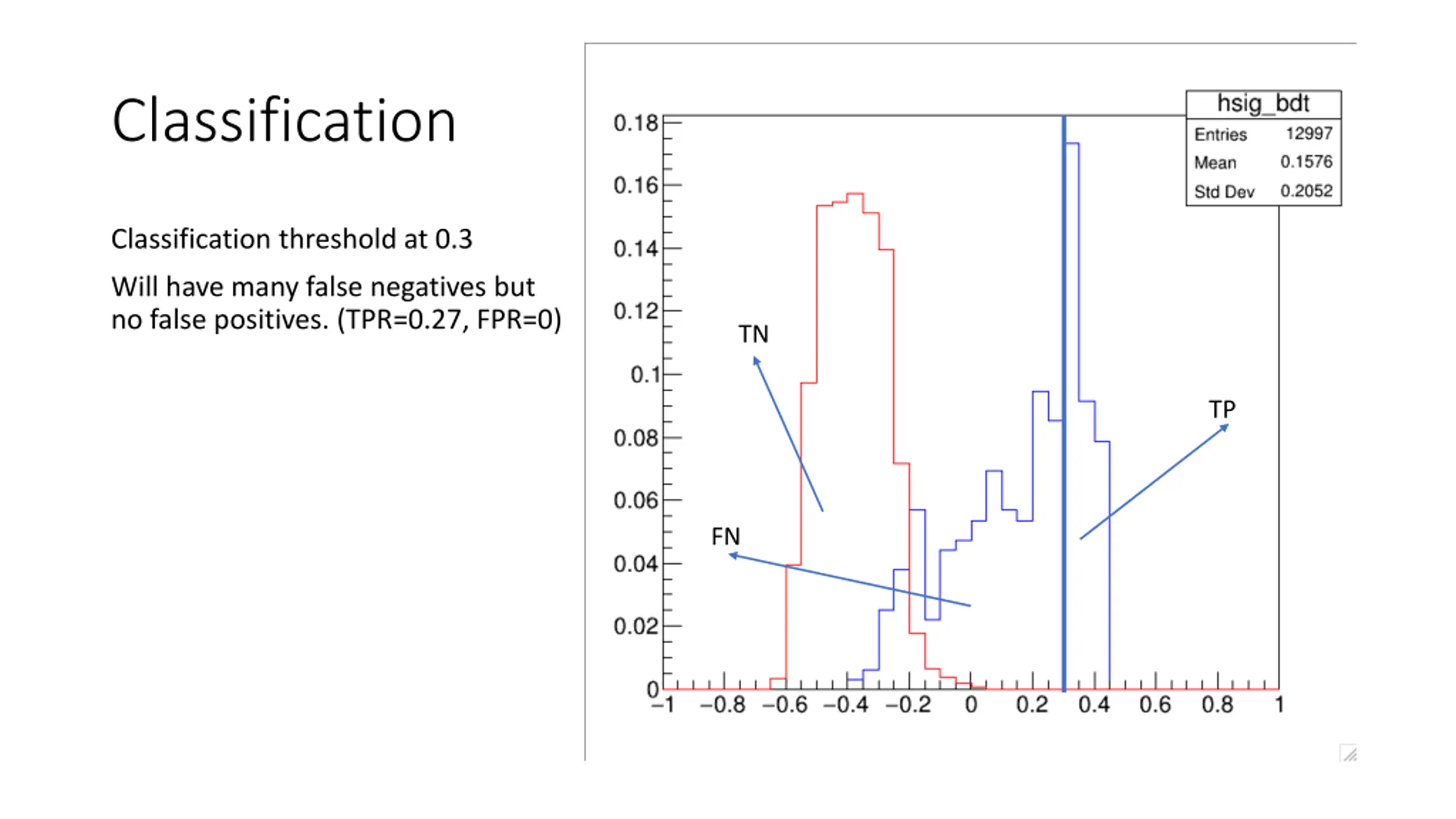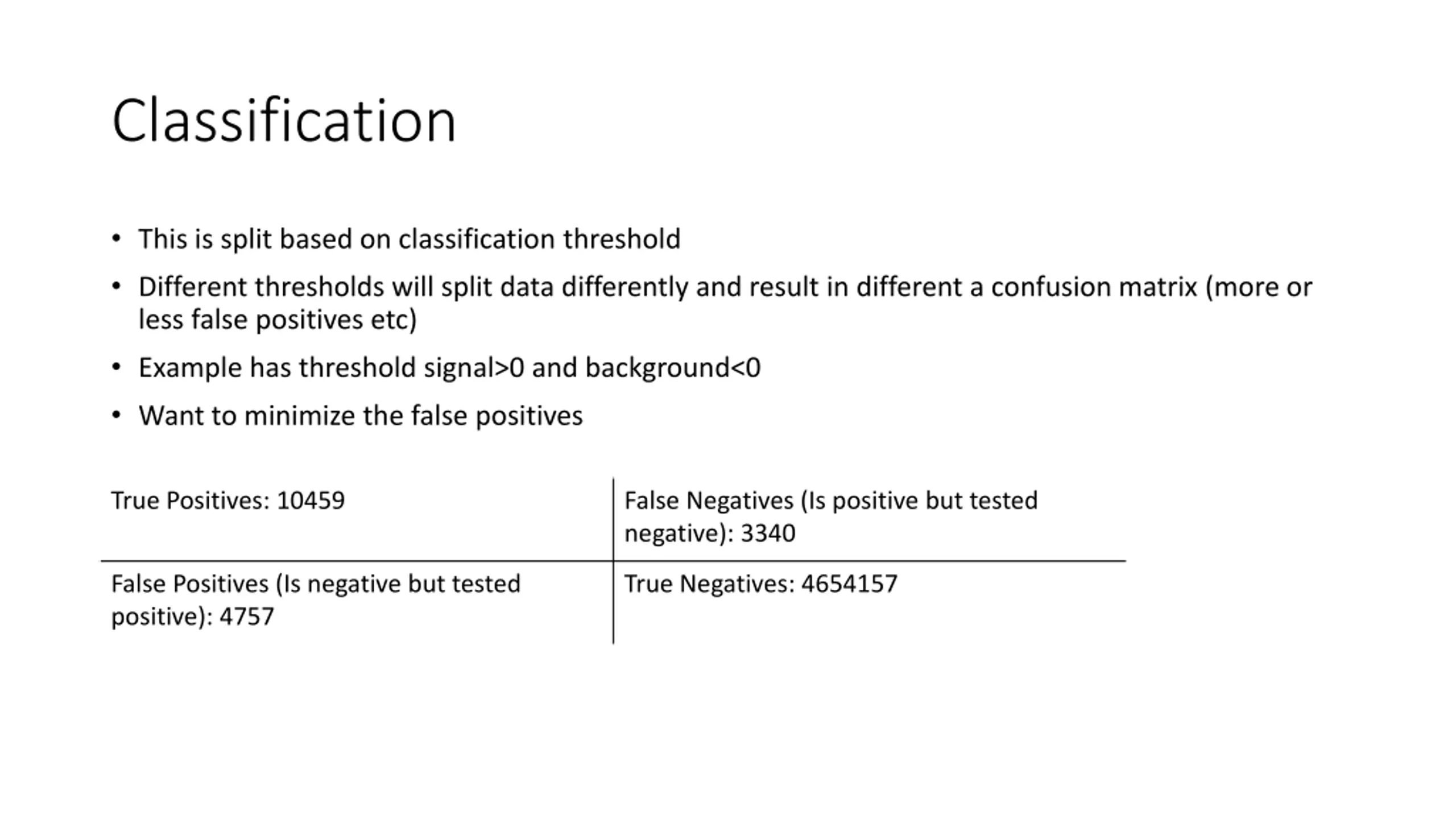 Classification This is split based on classification threshold Different thresholds will split data differently and result in different a confusion matrix (more or less false positives etc) Example has threshold signal>0 and background<0 Want to minimize the false positives True Positives: 10459 False Negatives (Is positive but tested negative): 3340 False Positives (Is negative but tested positive): 4757 True Negatives: 4654157