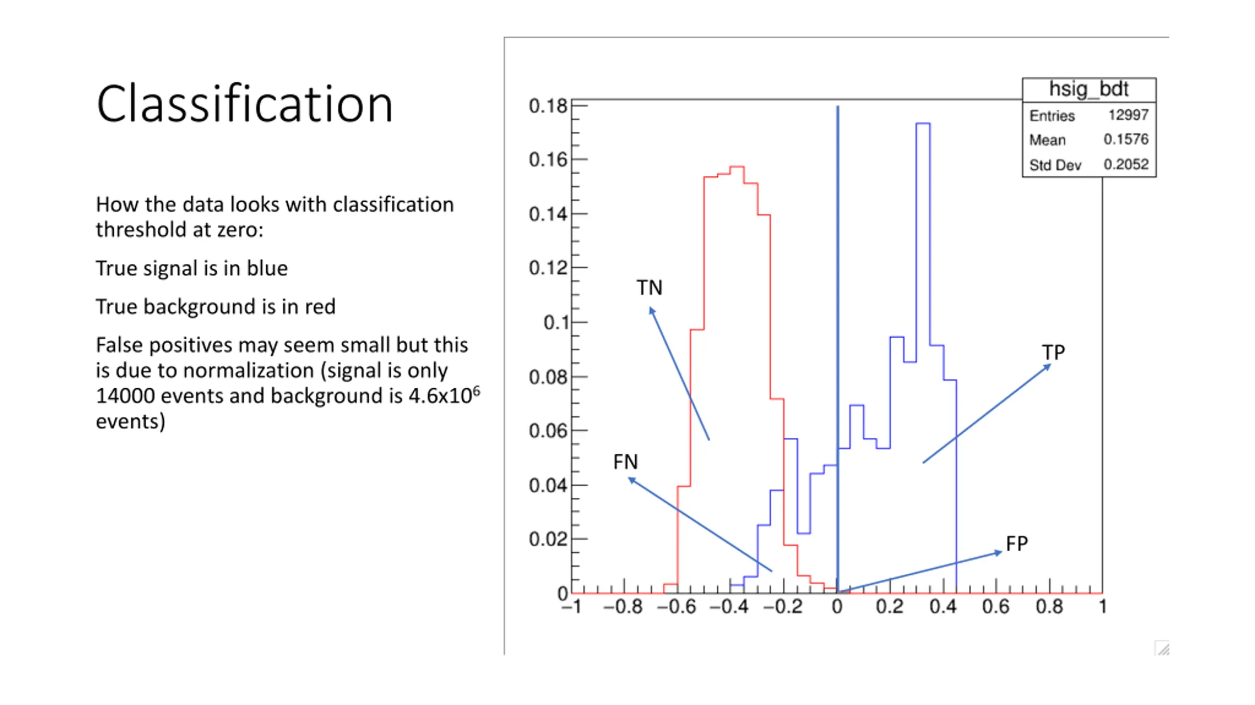 Classification How the data looks with classification threshold at zero: True signal is in blue TN True background is in red False positives may seem small but this is due to normalization (signal is only 14000 events and background is 4.6x106 events) TP FN FP