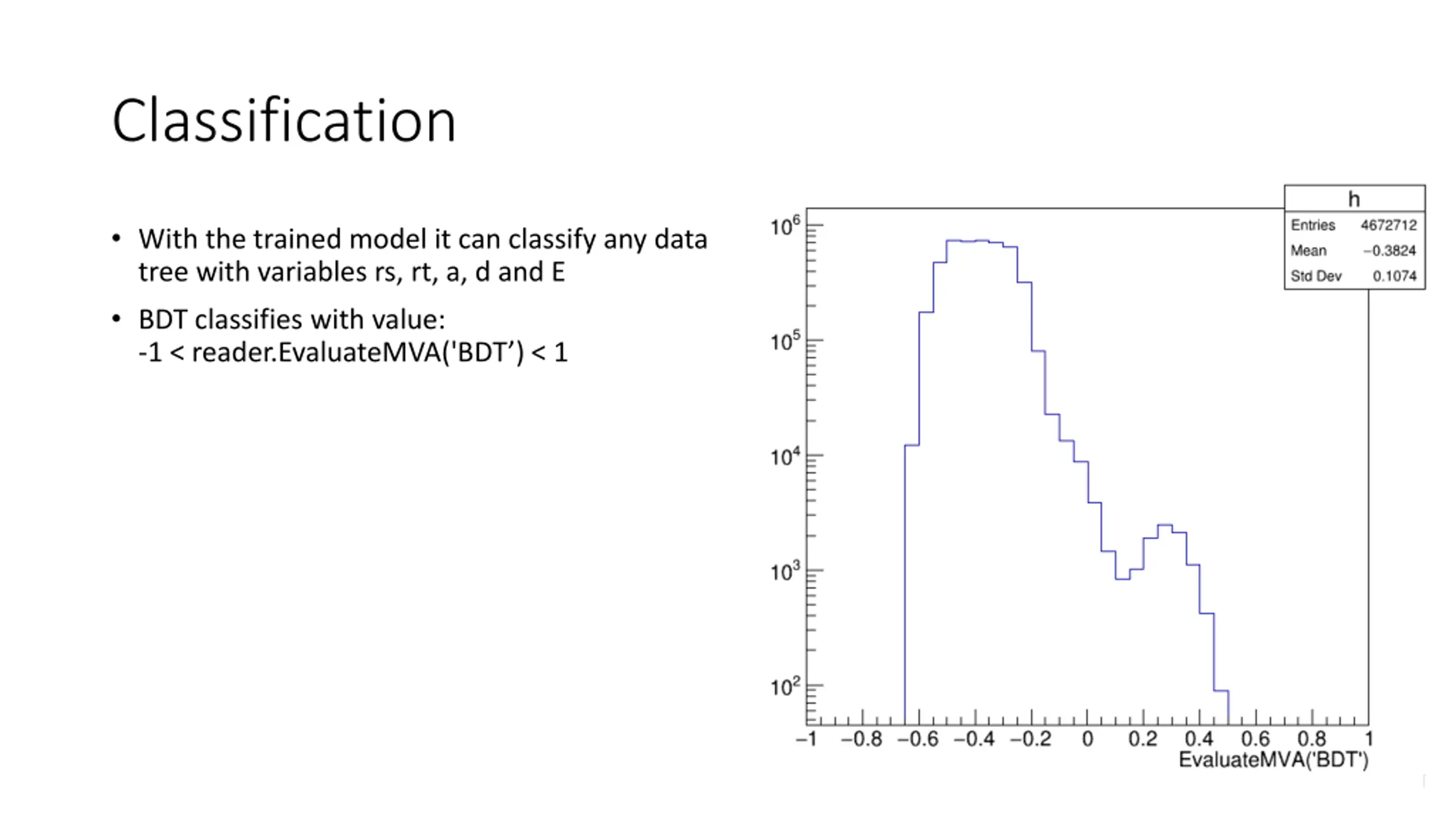 Classification With the trained model it can classify any data tree with variables rs, rt, a, d and E BDT classifies with value: -1 < reader.EvaluateMVA('BDT ) < 1