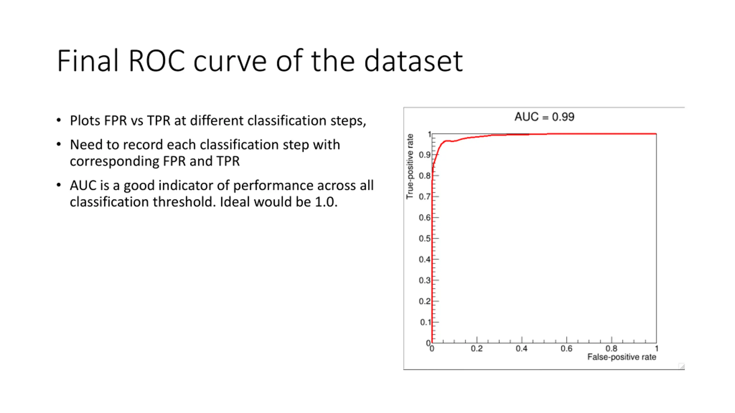 Final ROC curve of the dataset Plots FPR vs TPR at different classification steps, Need to record each classification step with corresponding FPR and TPR AUC is a good indicator of performance across all classification threshold. Ideal would be 1.0.