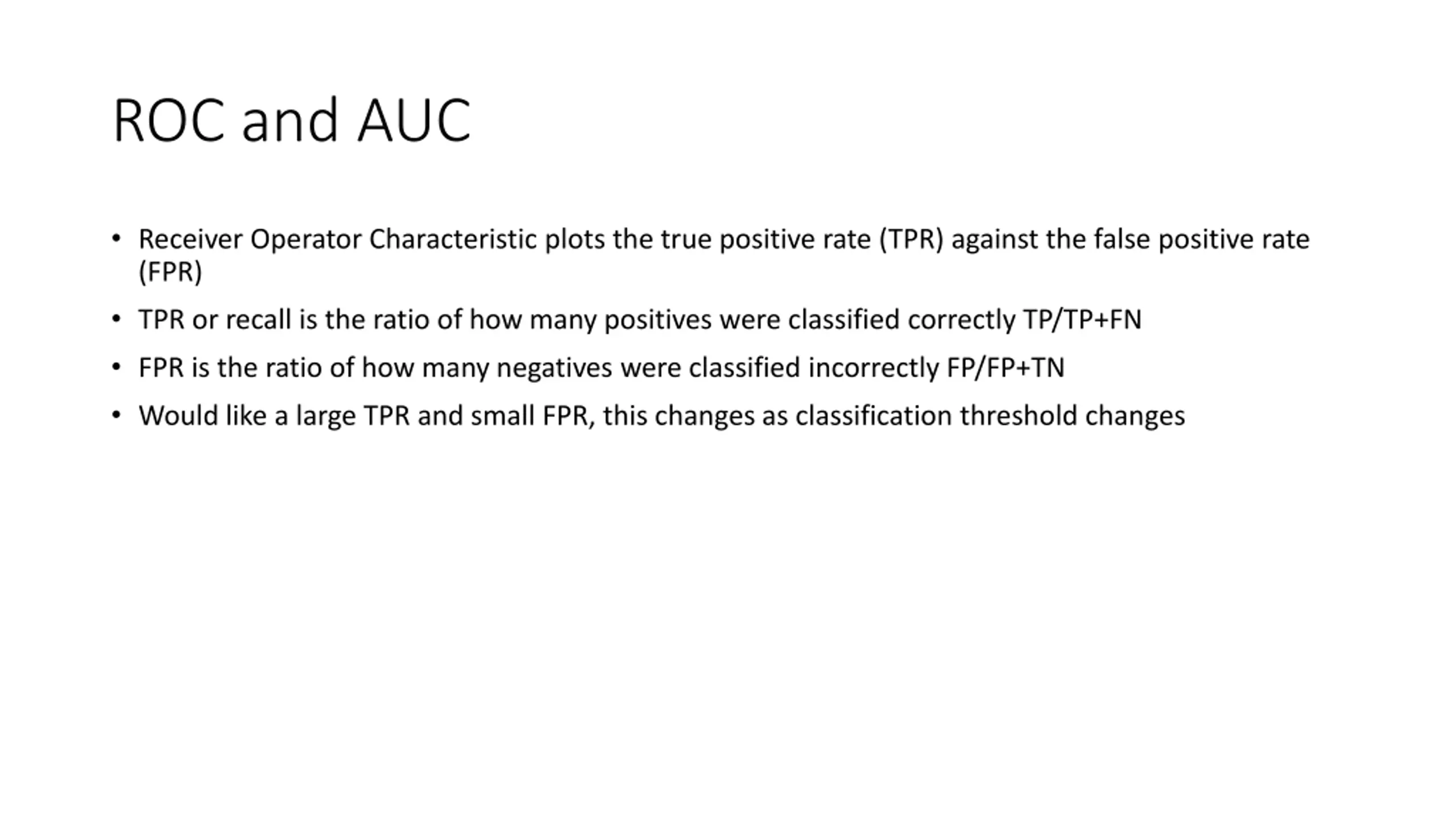 ROC and AUC Receiver Operator Characteristic plots the true positive rate (TPR) against the false positive rate (FPR) TPR or recall is the ratio of how many positives were classified correctly TP/TP+FN FPR is the ratio of how many negatives were classified incorrectly FP/FP+TN Would like a large TPR and small FPR, this changes as classification threshold changes