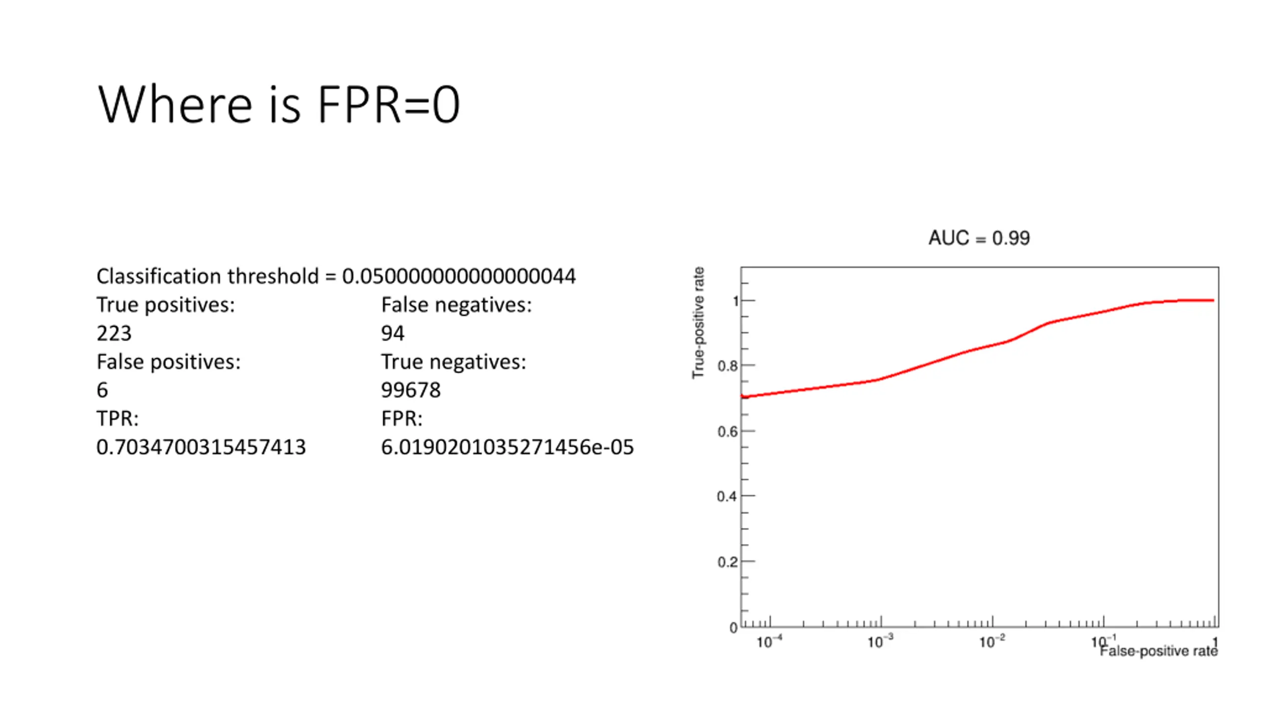 Where is FPR=0 Classification threshold = 0.050000000000000044 True positives: 223 False positives: 6 TPR: 0.7034700315457413 False negatives: 94 True negatives: 99678 FPR: 6.0190201035271456e-05