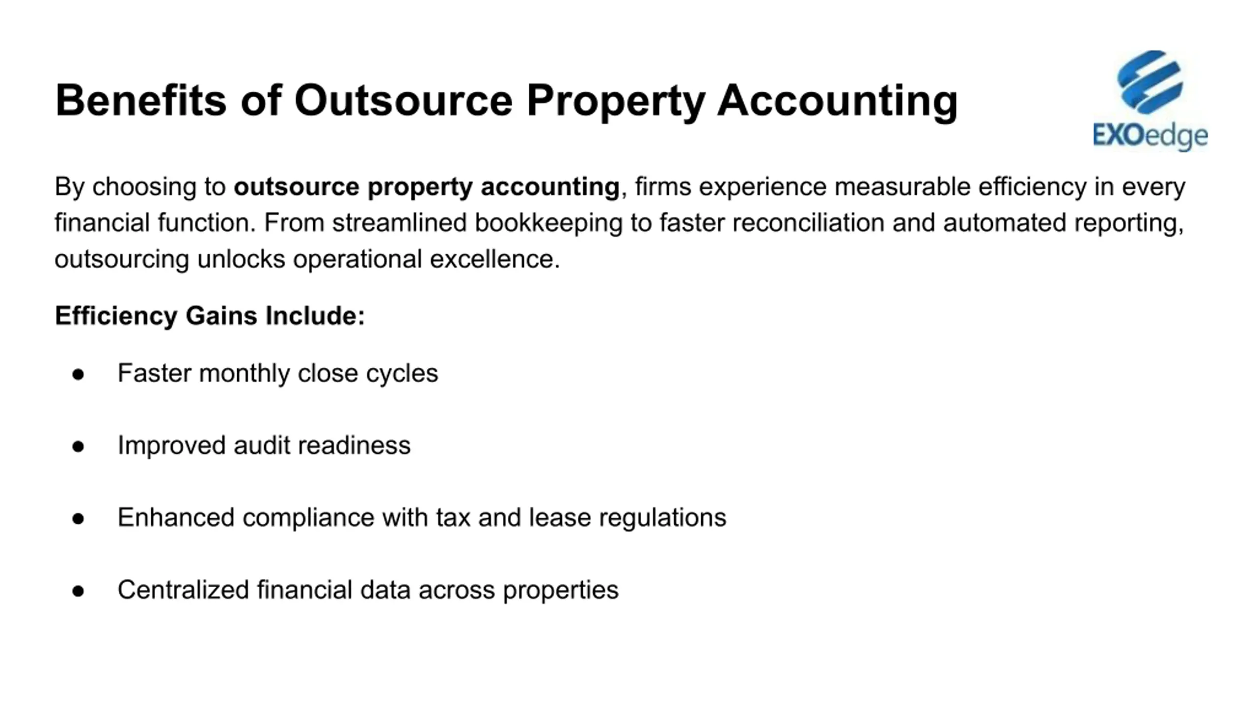 Benefits of Outsource Property Accounting By choosing to outsource property accounting, firms experience measurable efficiency in every financial function. From streamlined bookkeeping to faster reconciliation and automated reporting, outsourcing unlocks operational excellence. Efficiency Gains Include: Faster monthly close cycles Improved audit readiness Enhanced compliance with tax and lease regulations Centralized financial data across properties