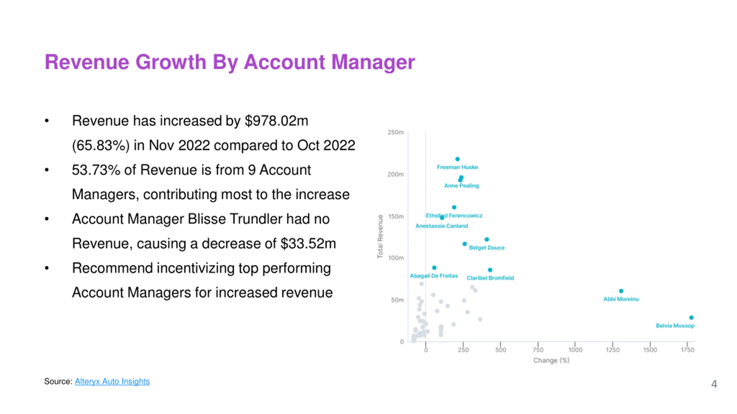 Revenue Growth By Account Manager Revenue has increased by $978.02m (65.83%) in Nov 2022 compared to Oct 2022 53.73% of Revenue is from 9 Account Managers, contributing most to the increase Account Manager Blisse Trundler had no Revenue, causing a decrease of $33.52m Recommend incentivizing top performing Account Managers for increased revenue Source: Alteryx Auto Insights 4