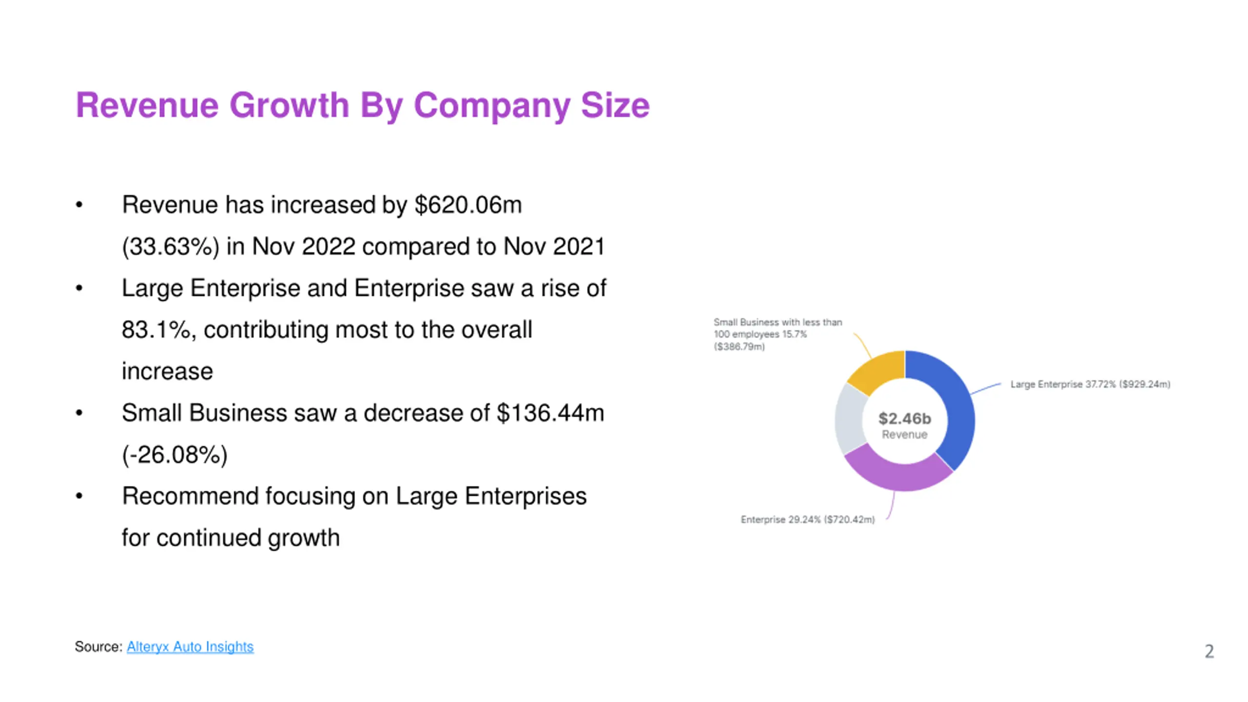 Revenue Growth By Company Size Revenue has increased by $620.06m (33.63%) in Nov 2022 compared to Nov 2021 Large Enterprise and Enterprise saw a rise of 83.1%, contributing most to the overall increase Small Business saw a decrease of $136.44m (-26.08%) Recommend focusing on Large Enterprises for continued growth Source: Alteryx Auto Insights 2