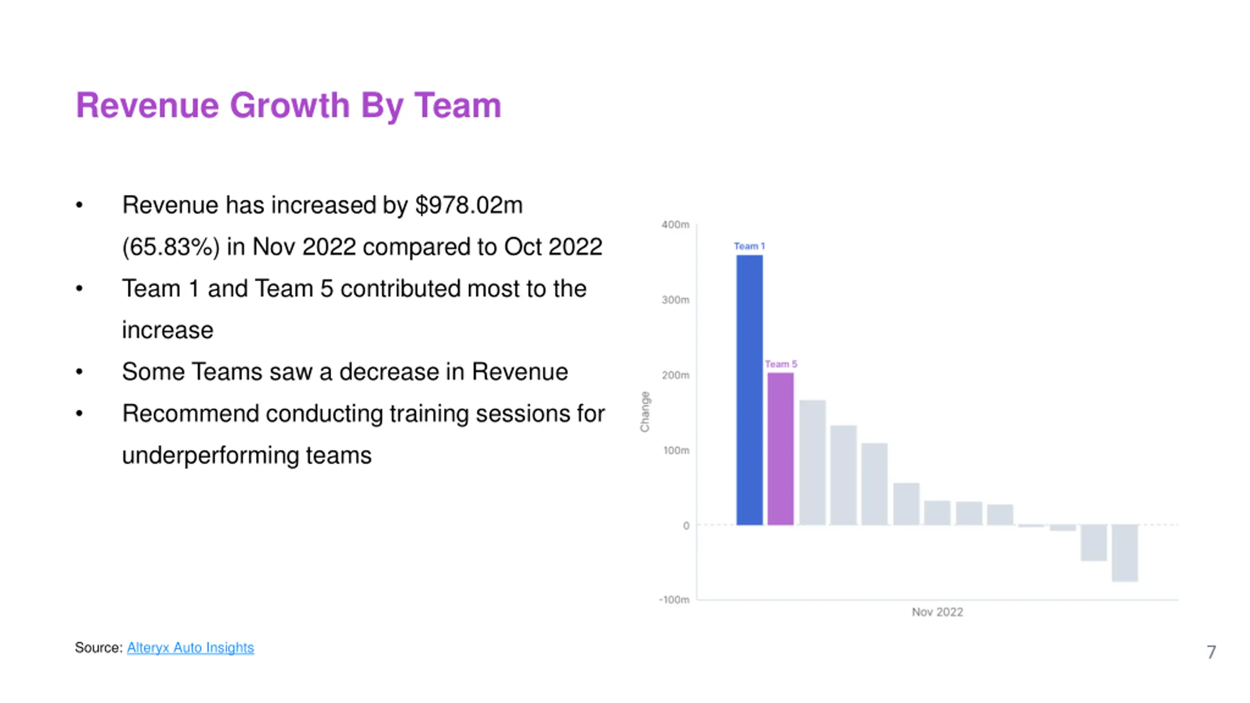 Revenue Growth By Team Lead Revenue has increased by $978.02m (65.83%) in Nov 2022 compared to Oct 2022 Myrle Shelton and Noll Britten contributed most to the increase Some Team Leads saw a decrease in Revenue Recommend recognizing and rewarding top performing Team Leads Source: Alteryx Auto Insights 6