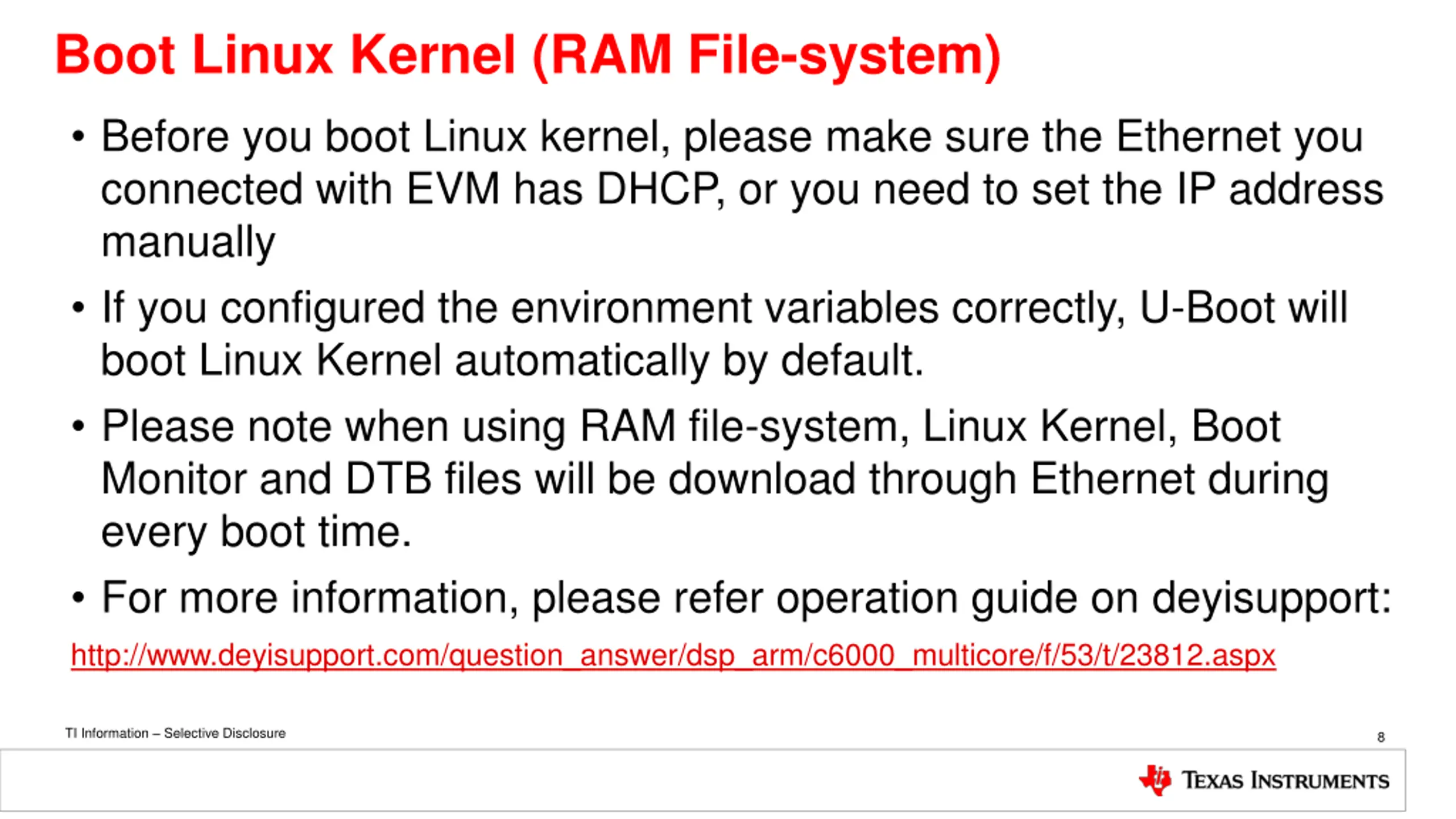 Boot Linux Kernel (RAM File-system) Before you boot Linux kernel, please make sure the Ethernet you connected with EVM has DHCP, or you need to set the IP address manually If you configured the environment variables correctly, U-Boot will boot Linux Kernel automatically by default. Please note when using RAM file-system, Linux Kernel, Boot Monitor and DTB files will be download through Ethernet during every boot time. For more information, please refer operation guide on deyisupport: http://www.deyisupport.com/question_answer/dsp_arm/c6000_multicore/f/53/t/23812.aspx TI Information Selective Disclosure 8