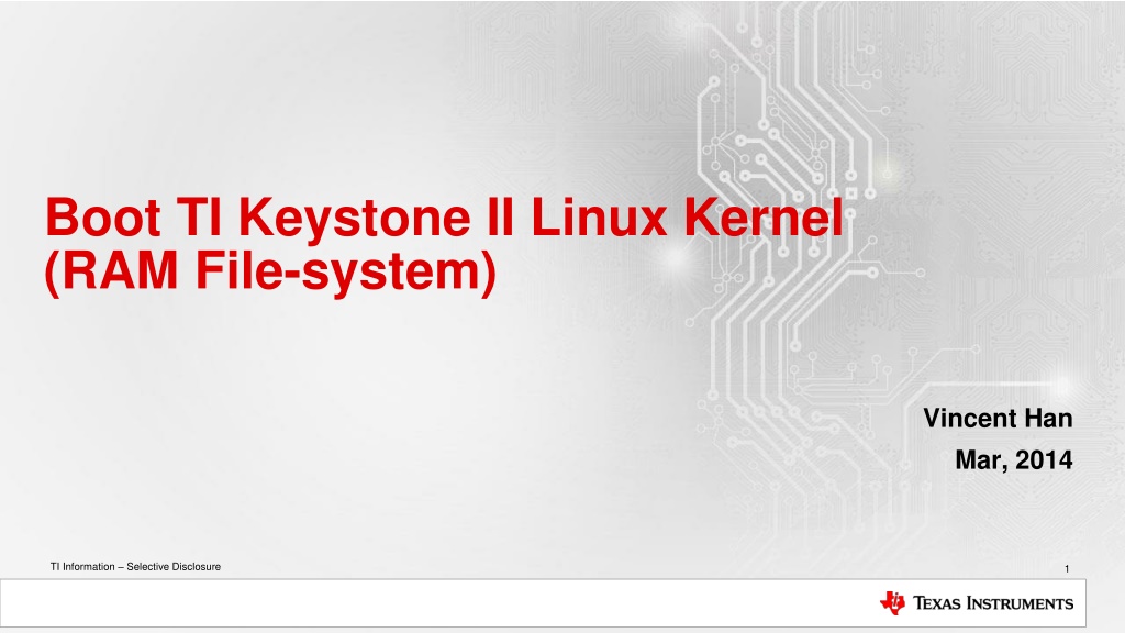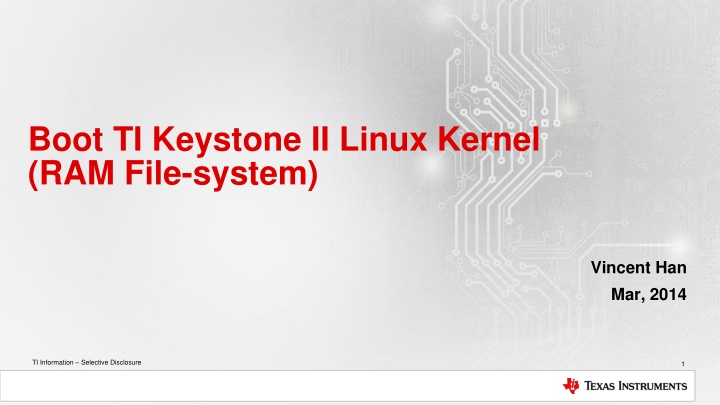 Boot TI Keystone II Linux Kernel (RAM File-system) Vincent Han Mar, 2014 TI Information Selective Disclosure TI Information Selective Disclosure 1